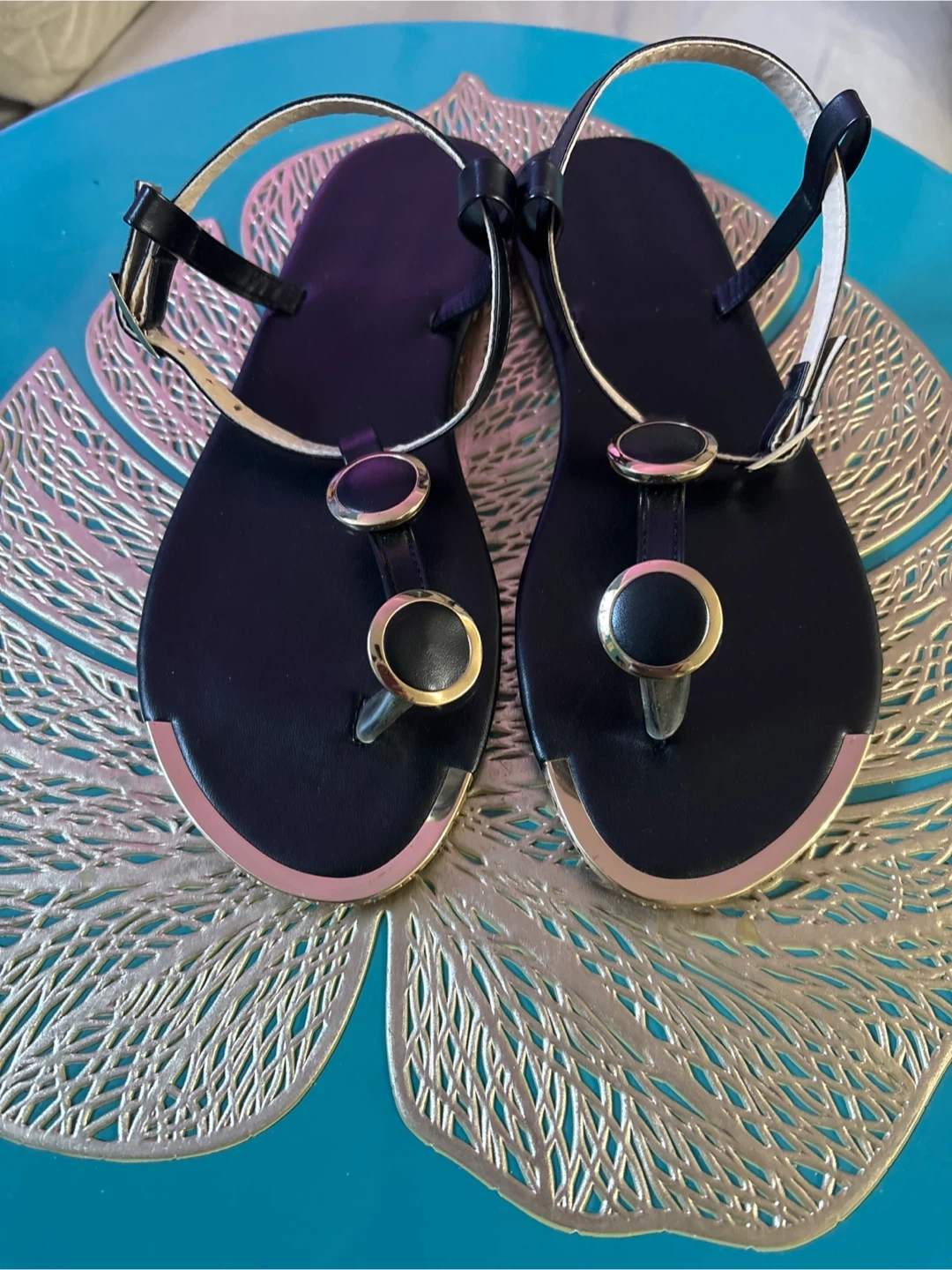 71Cute pair of black sandals with gold accents! They're in good condition and ready for a new home.