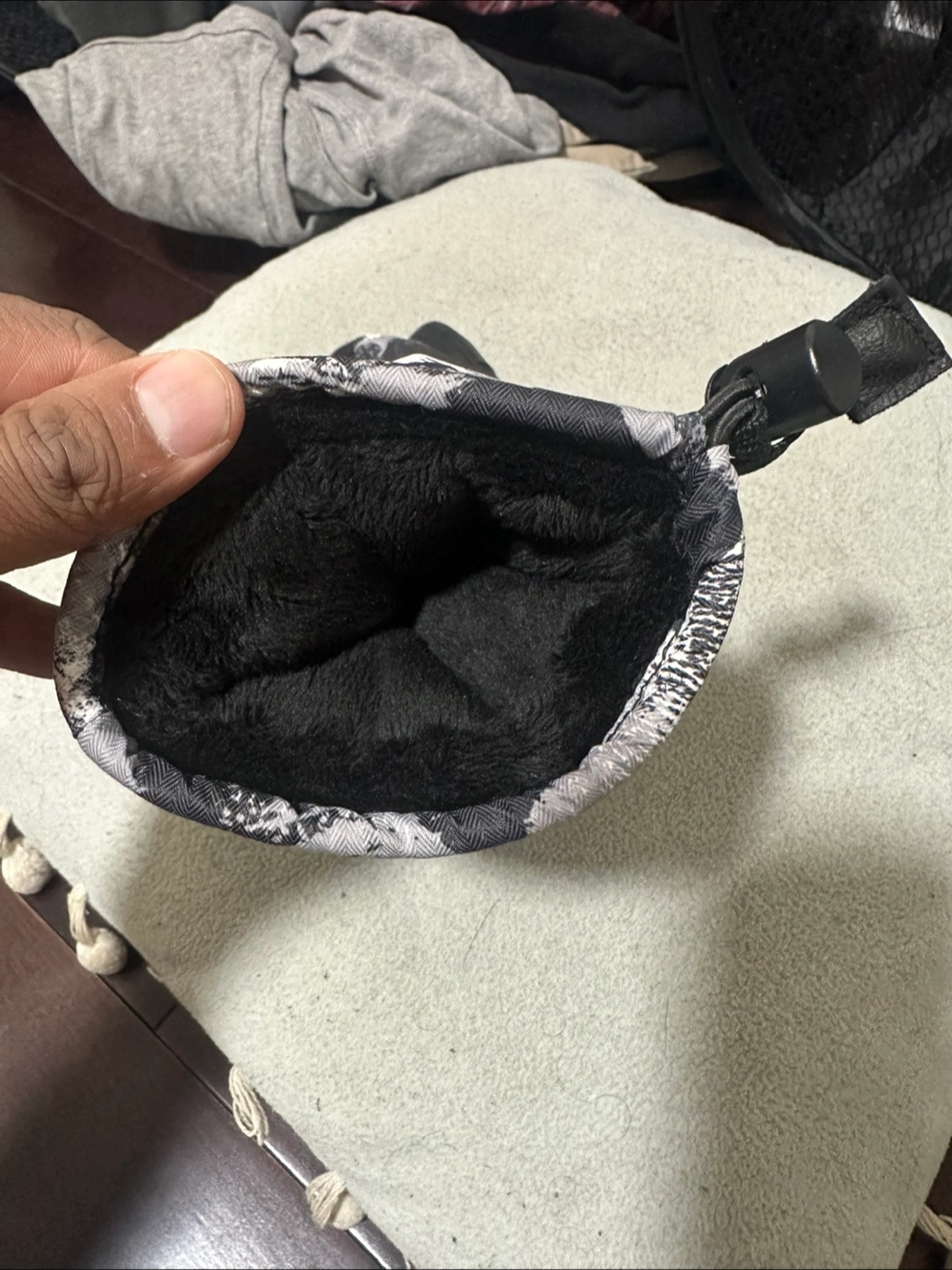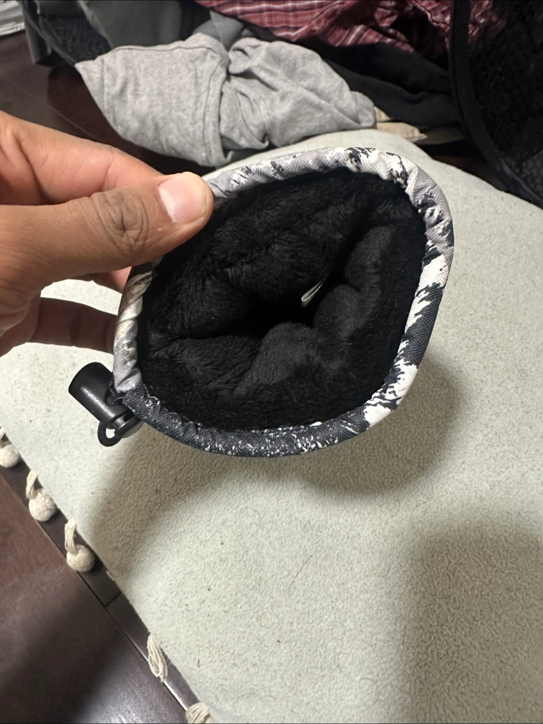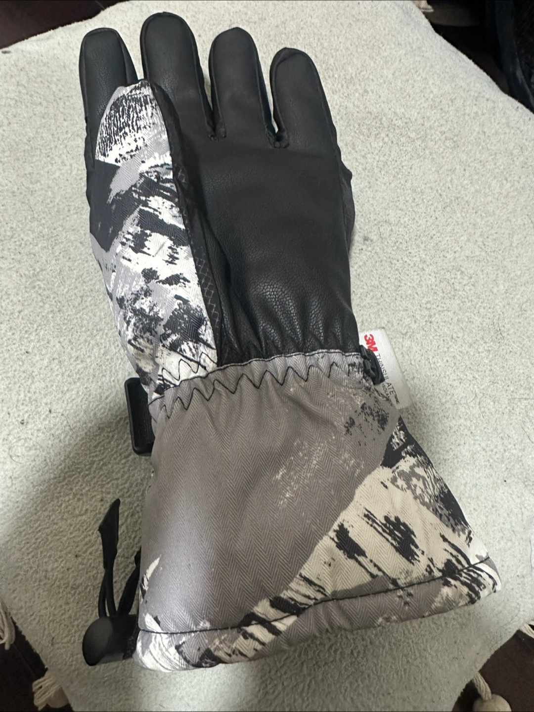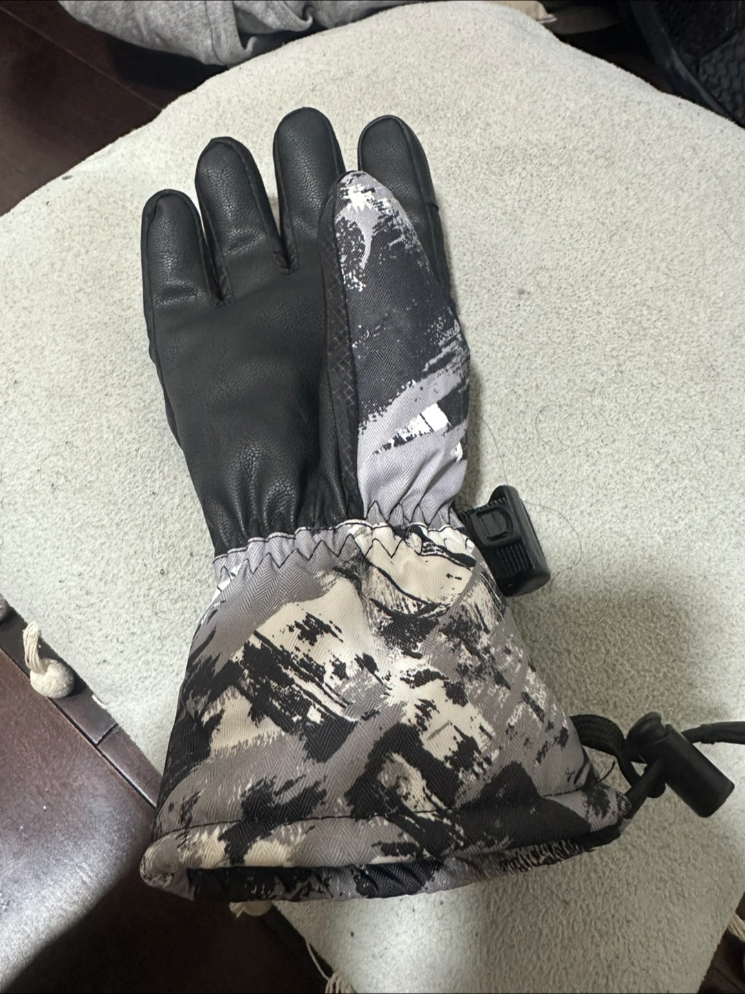 92Selling a winter glove in black and grey. It looks to be in good condition and has a drawstring to tighten. The inside is lined with a soft black fabric to keep your hands warm during the cold winter months!