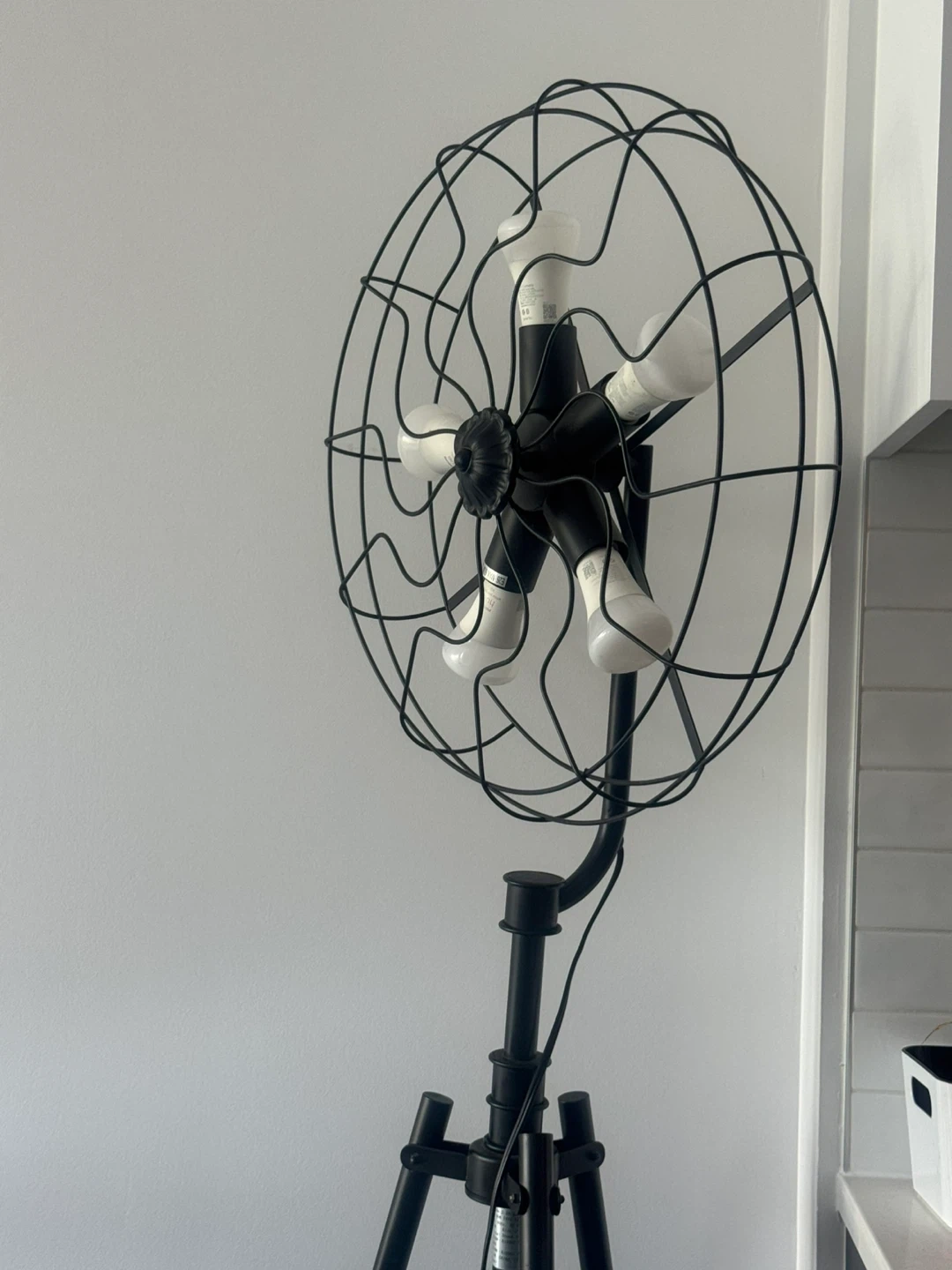 Beautiful looking floor lamp. This is a super cool industrial style floor lamp! It features a black metal cage design with a tripod base. It's in great condition and would be a stylish addition to any room
