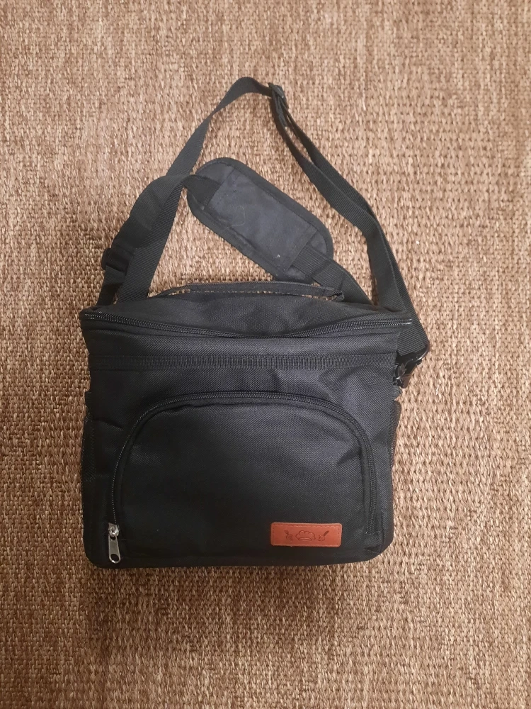 140This is a black insulated lunch bag, perfect for keeping your food cool. It comes with a convenient shoulder strap for easy carrying. The bag has a front pocket with a zipper and a small logo on the front.