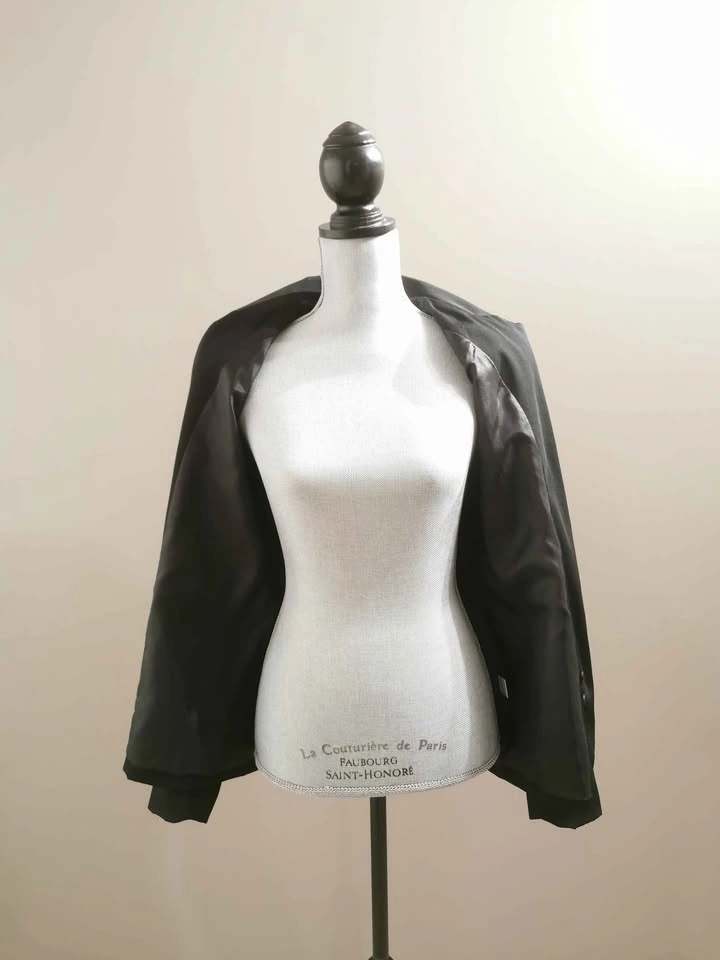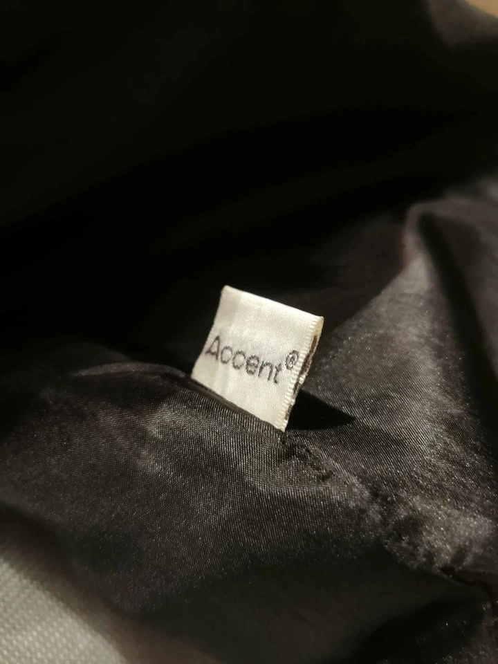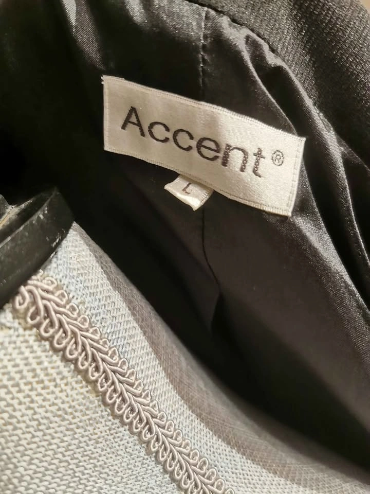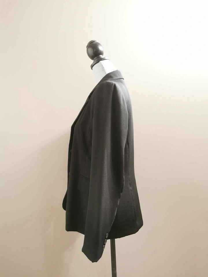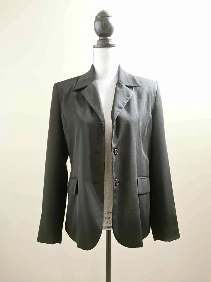 15- Accent brand size L black women's suit business blazer jacket. - Jacquard striped texture fabric with satin feel black lining. - Thick padded shoulders. - 3 buttons at front and 2 deep pockets. - In excellent condition, no flaws noted. - Pet and smoke free home.