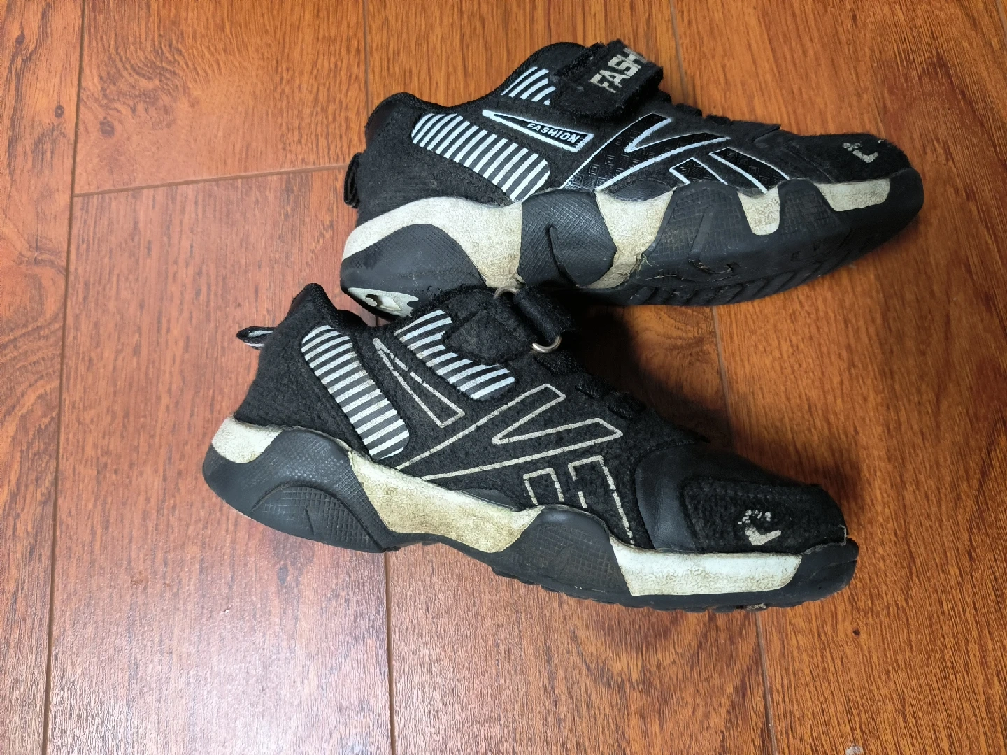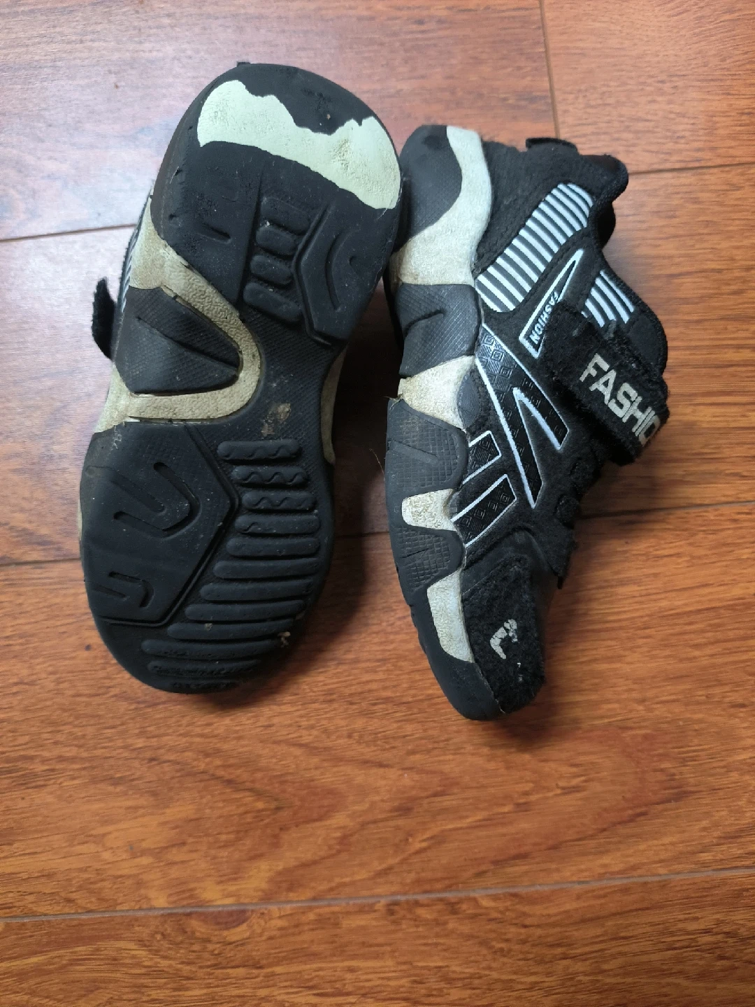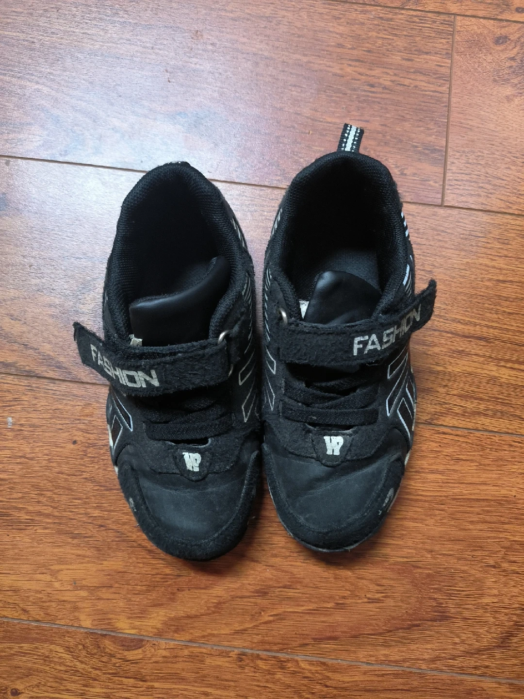 10These black kids' shoes have a sporty look with white accents. They show some signs of wear, as you can see in the photos, but they're still ready for a new adventure