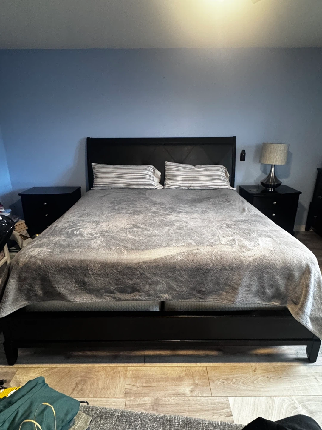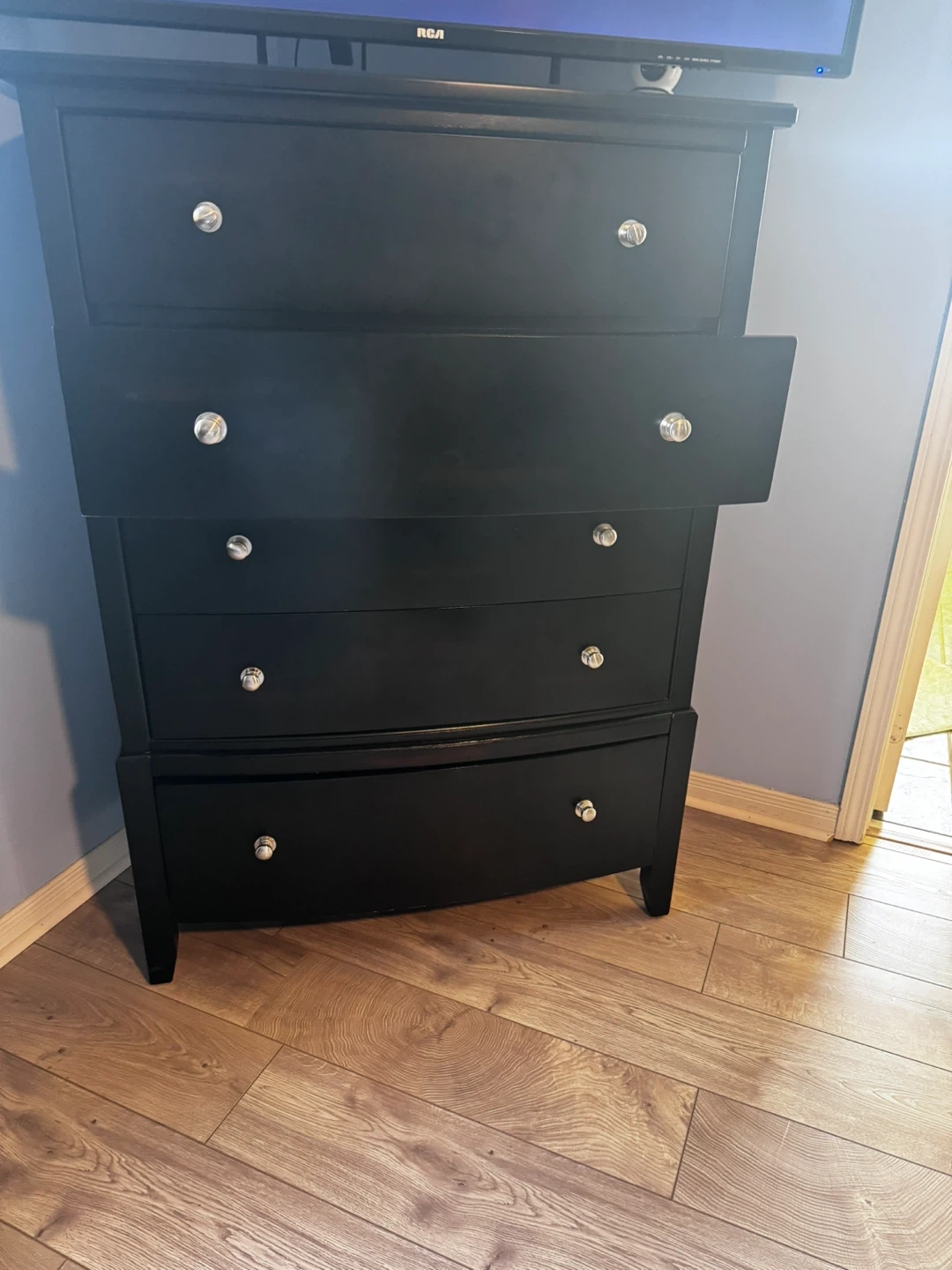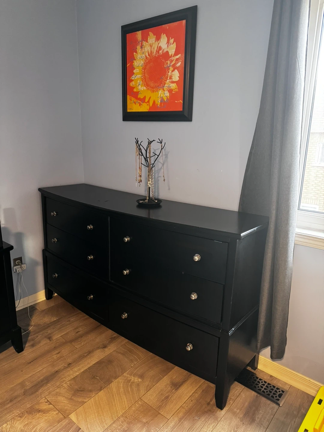 10Selling a bedroom furniture set in black! Includes a bed frame, two nightstands, a dresser, and a tall dresser. All pieces are in good condition and would be a great addition to any bedroom Bed - 79.9width and 87 length