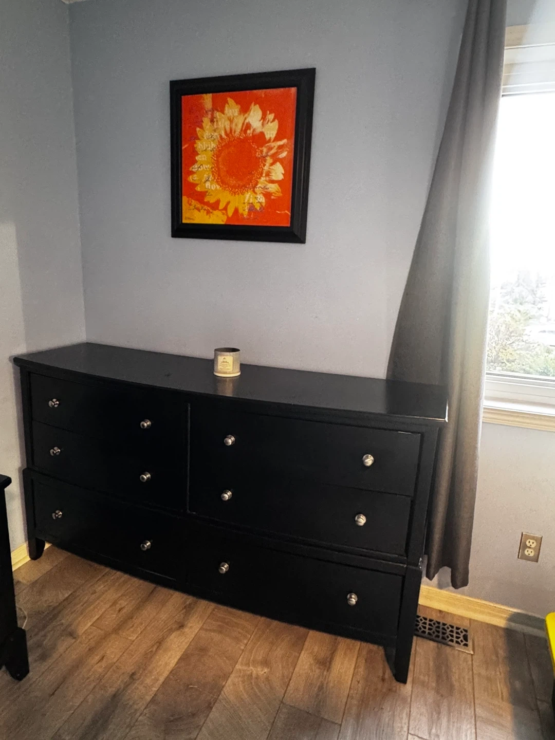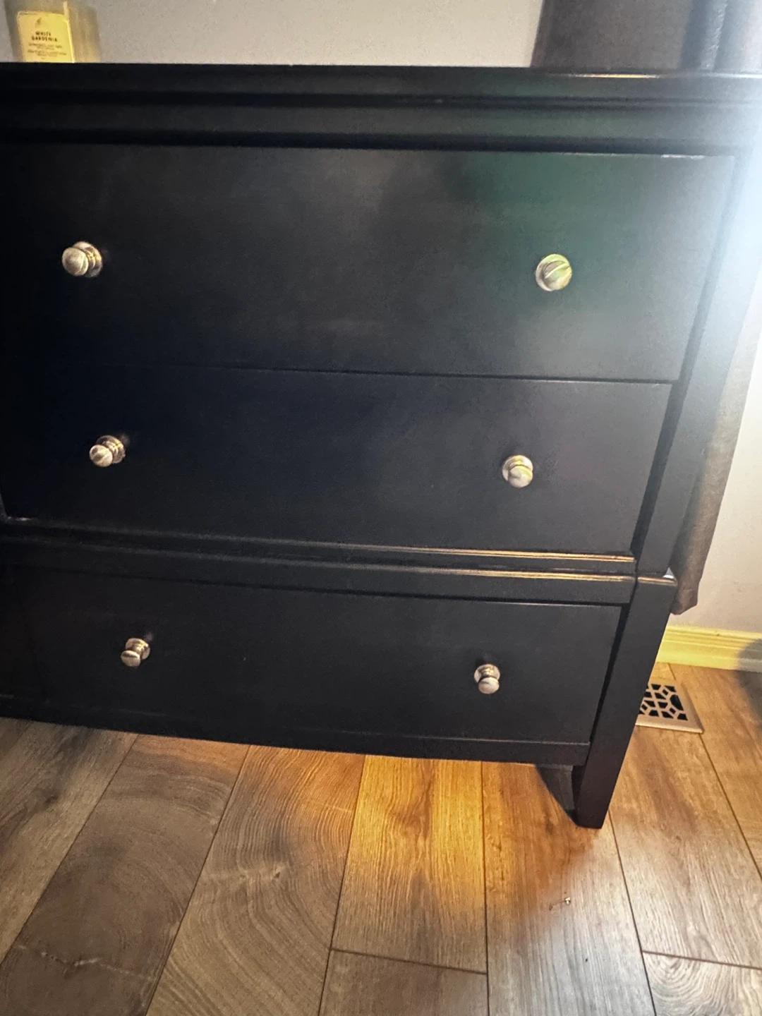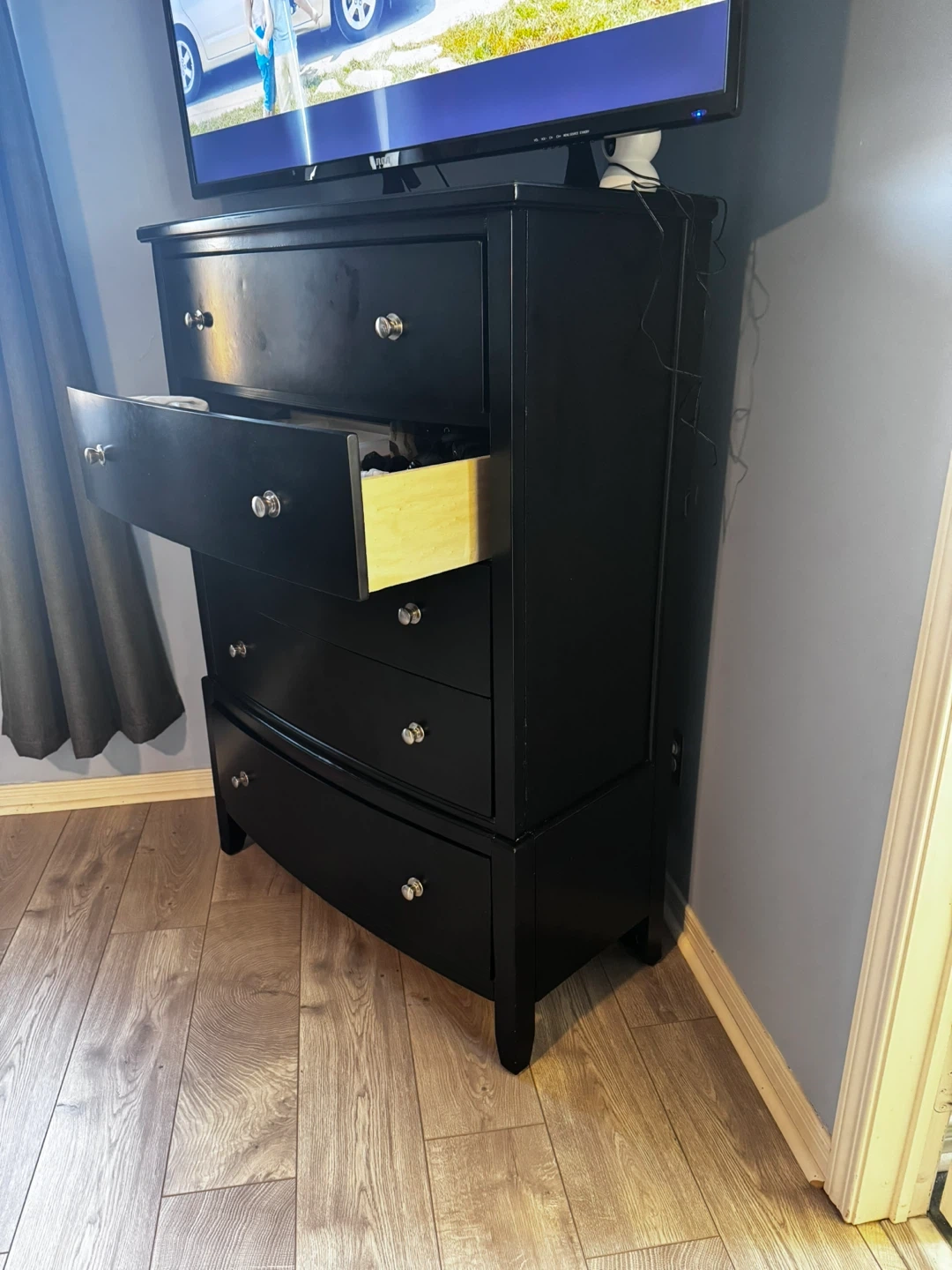 10Selling a bedroom furniture set in black! Includes a bed frame, two nightstands, a dresser, and a tall dresser. All pieces are in good condition and would be a great addition to any bedroom Bed - 79.9width and 87 length