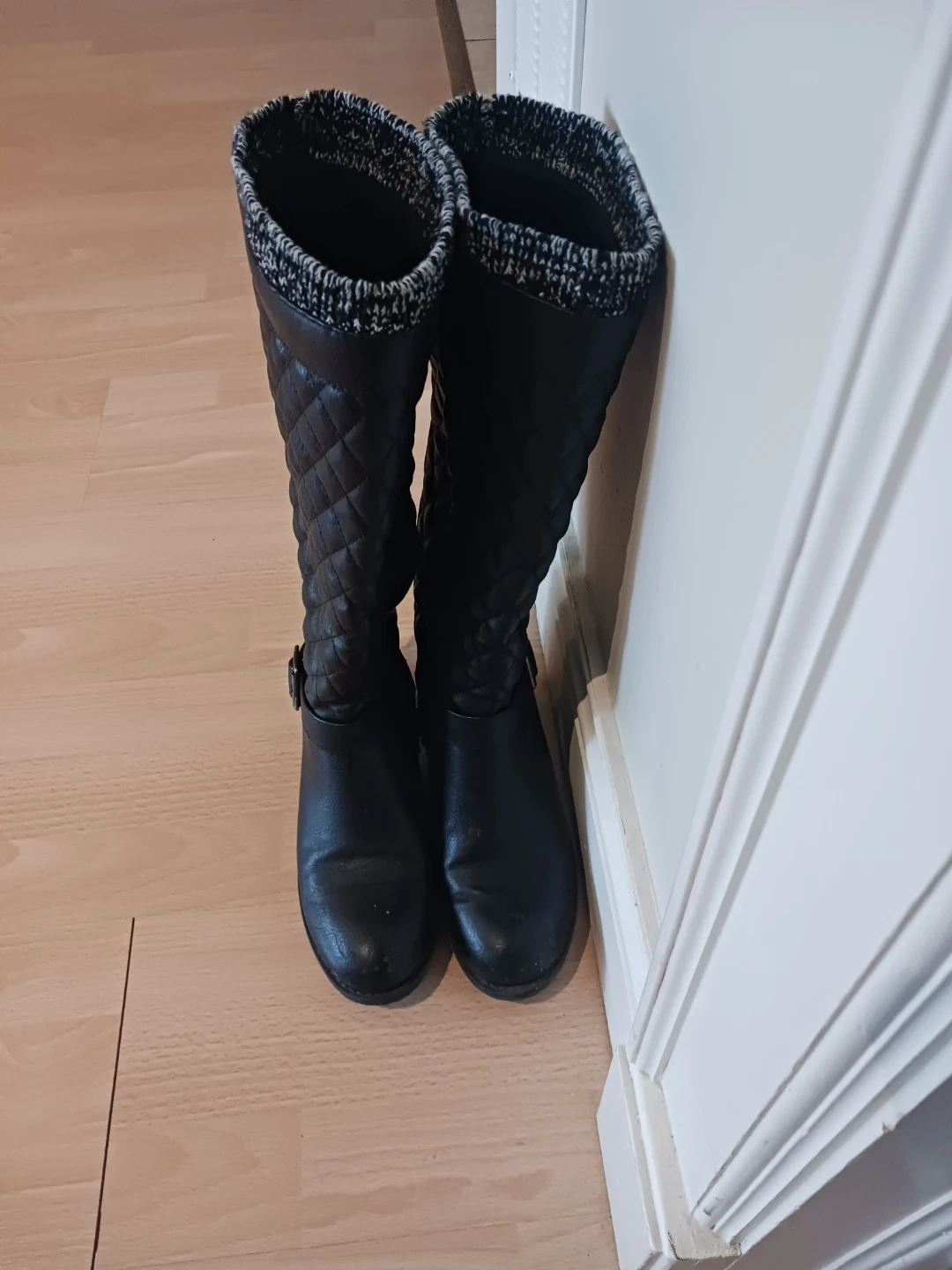 10Cute pair of black knee-high boots! They're a women's size 7 and feature a lace-up design on the back and a buckle detail near the ankle. The top part has a cozy knit texture. Perfect for fall or winter!