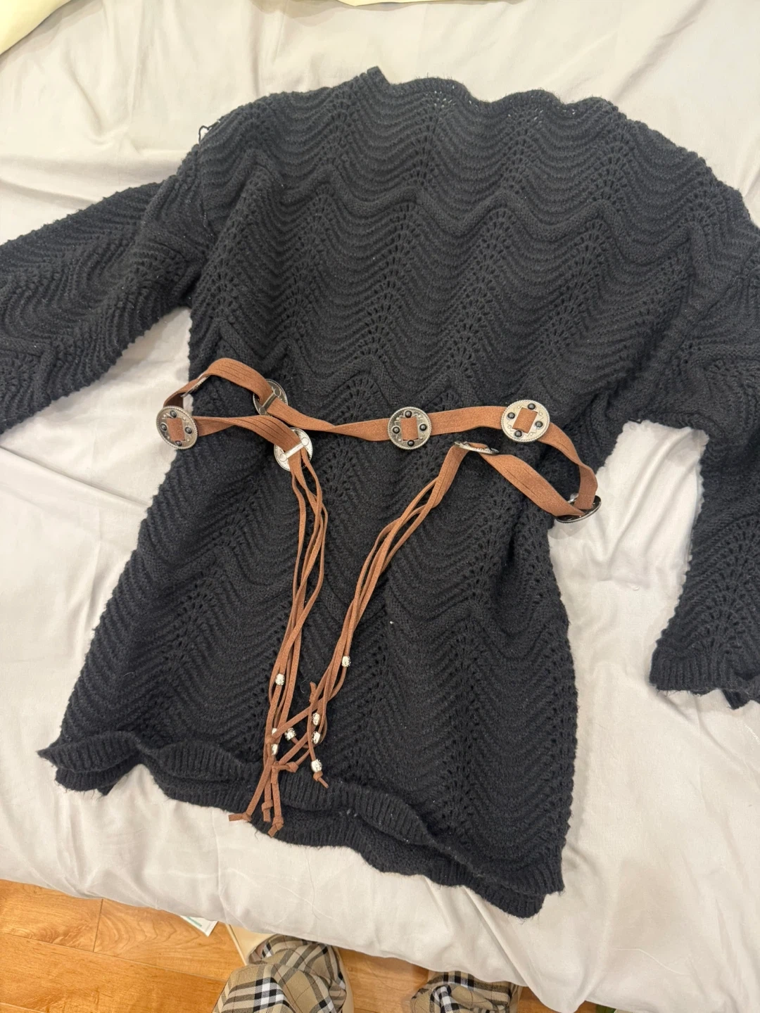 25Selling a cute black knit sweater dress, perfect for fall! It comes with a stylish brown belt to cinch the waist. The dress is in great condition and ready for a new home
