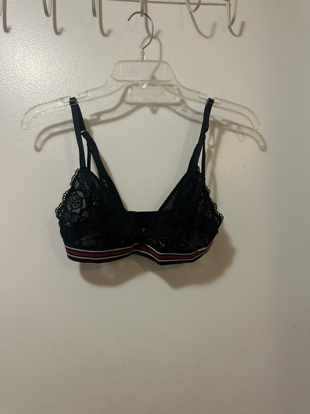 10Selling a cute black lace bralette. It's in good condition and features a stylish lace design with a red and white striped band. Perfect for adding a touch of elegance to your wardrobe!