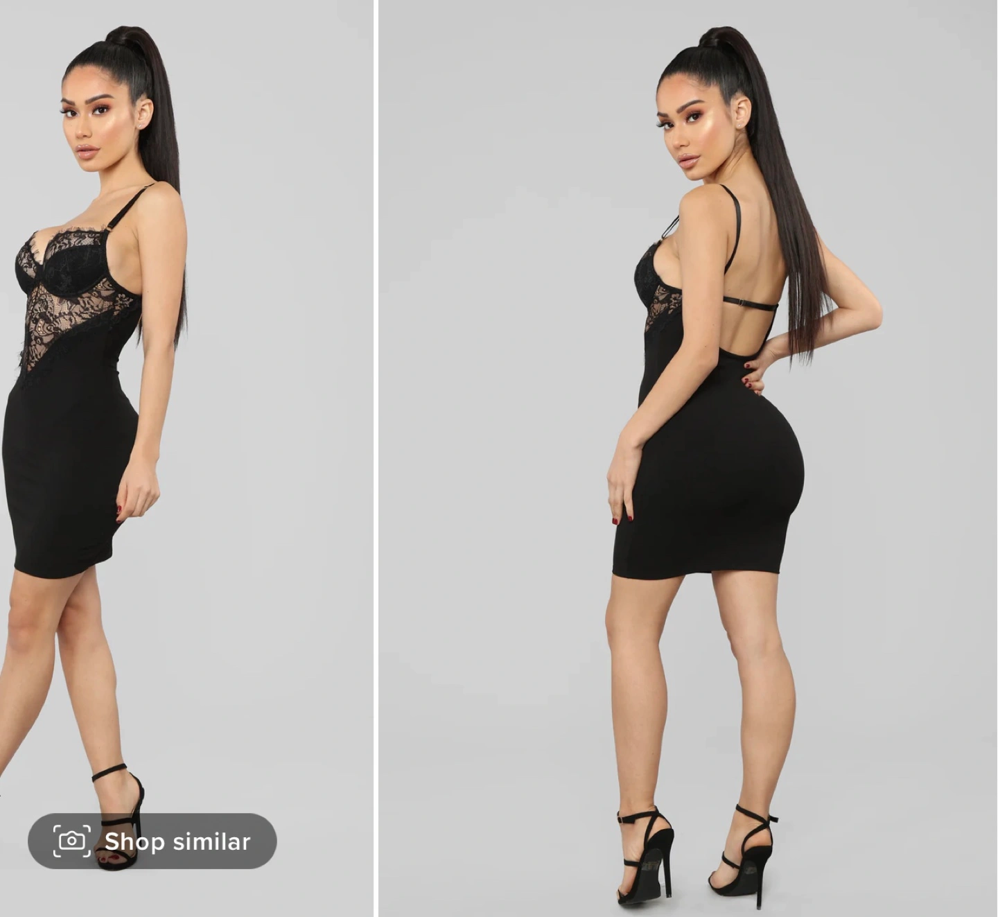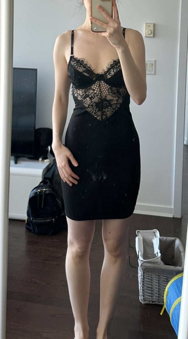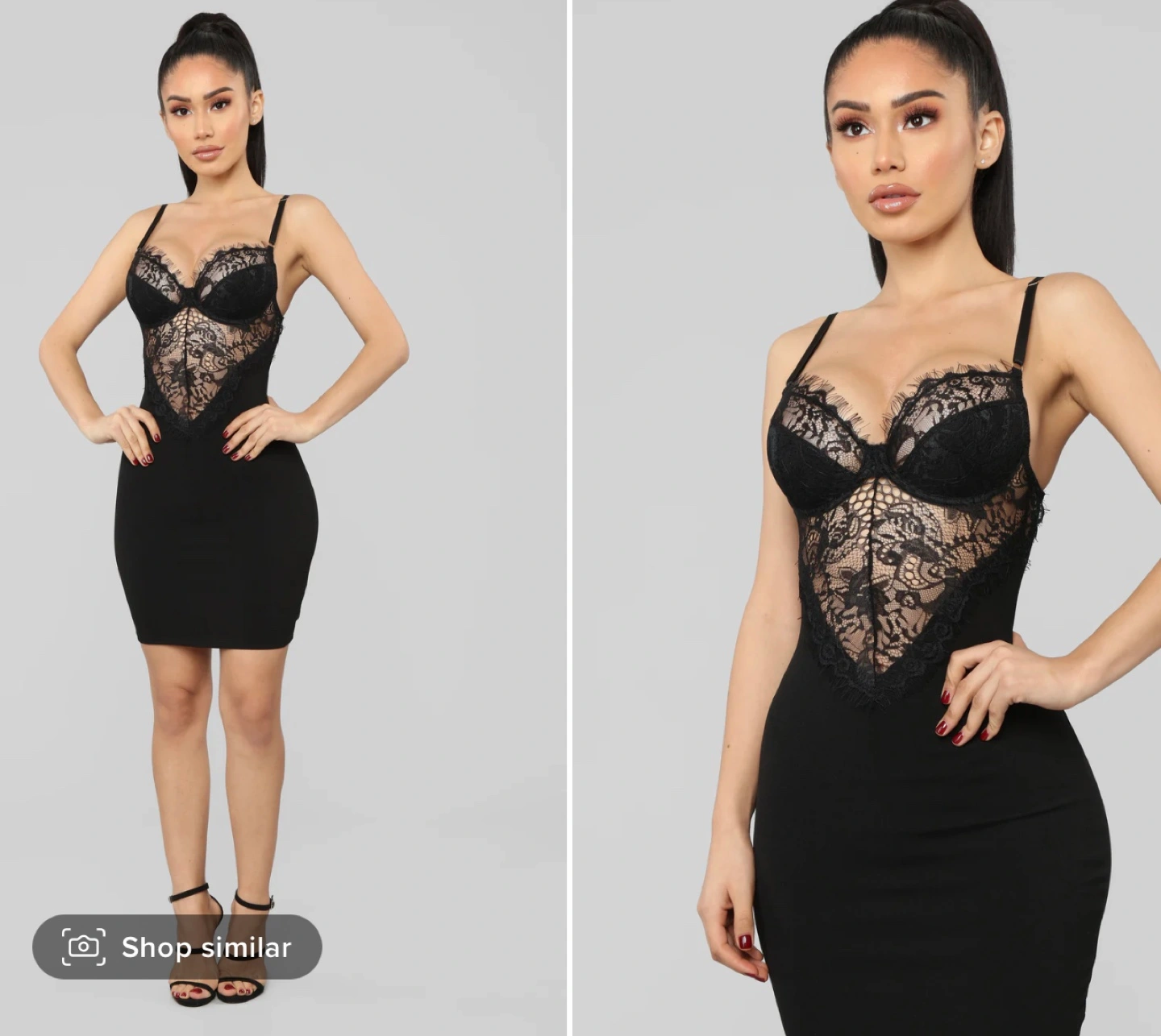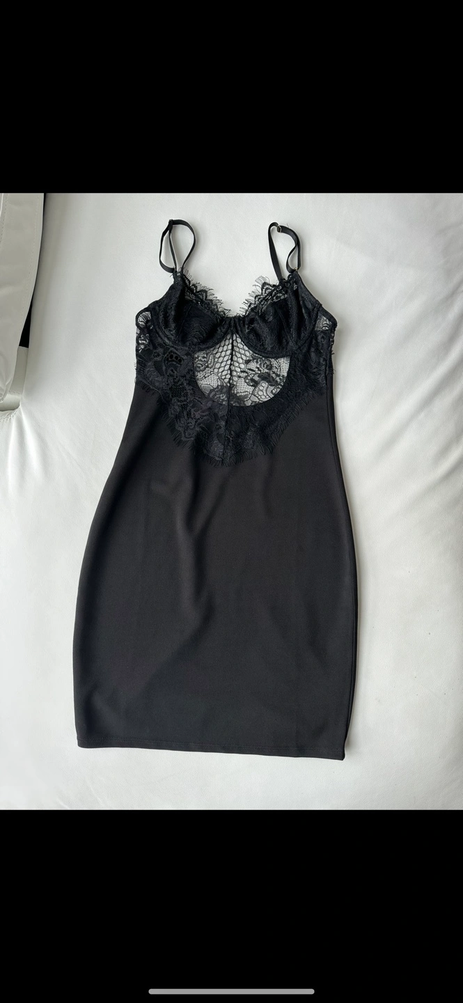 384Black mini dress with lace detailing. Spaghetti straps and a fitted silhouette. Great for a night out.