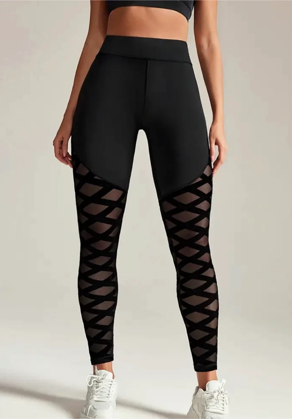 These black leggings feature a stylish lattice panel design. They're perfect for workouts or everyday wear. The material is comfortable and provides a good fit. These leggings are in excellent condition!
