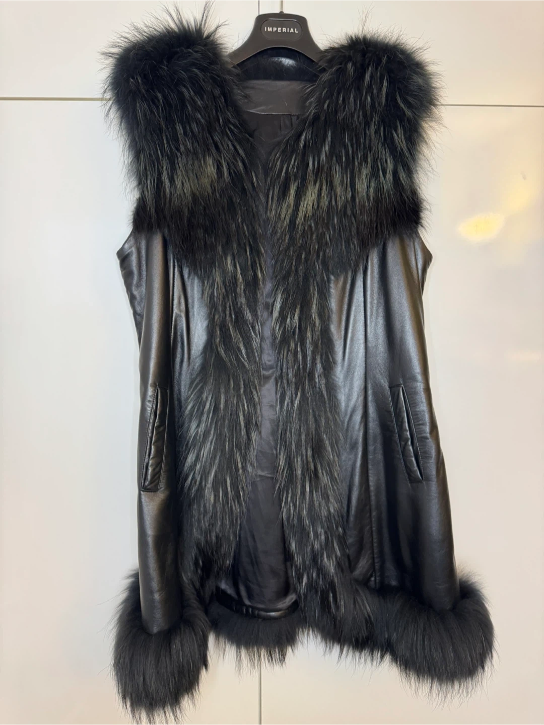 155Black sheep leather vest with large raccoon hair trim. Stylish and easy to pair with outfits.