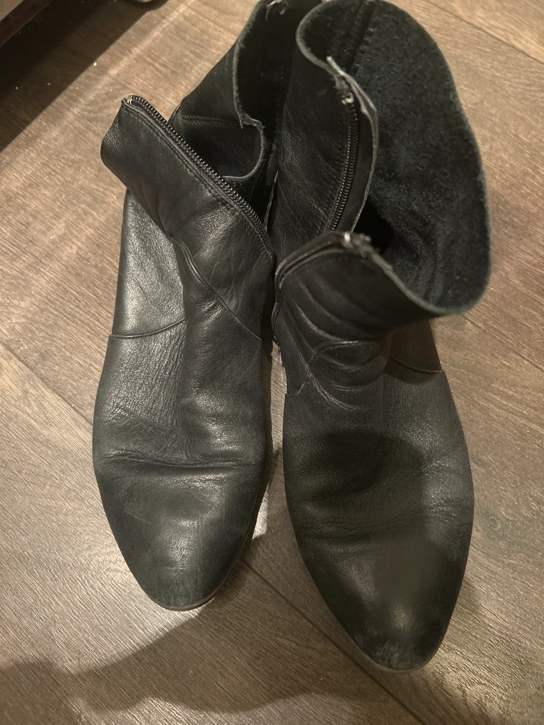 139Selling a pair of black leather ankle boots. They have a zipper closure and are in good condition, showing some signs of wear as pictured. Perfect for adding a bit of edge to your outfit!