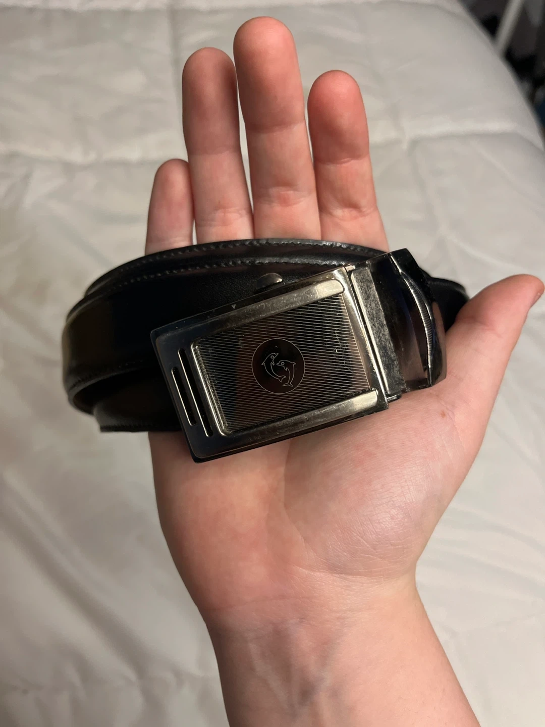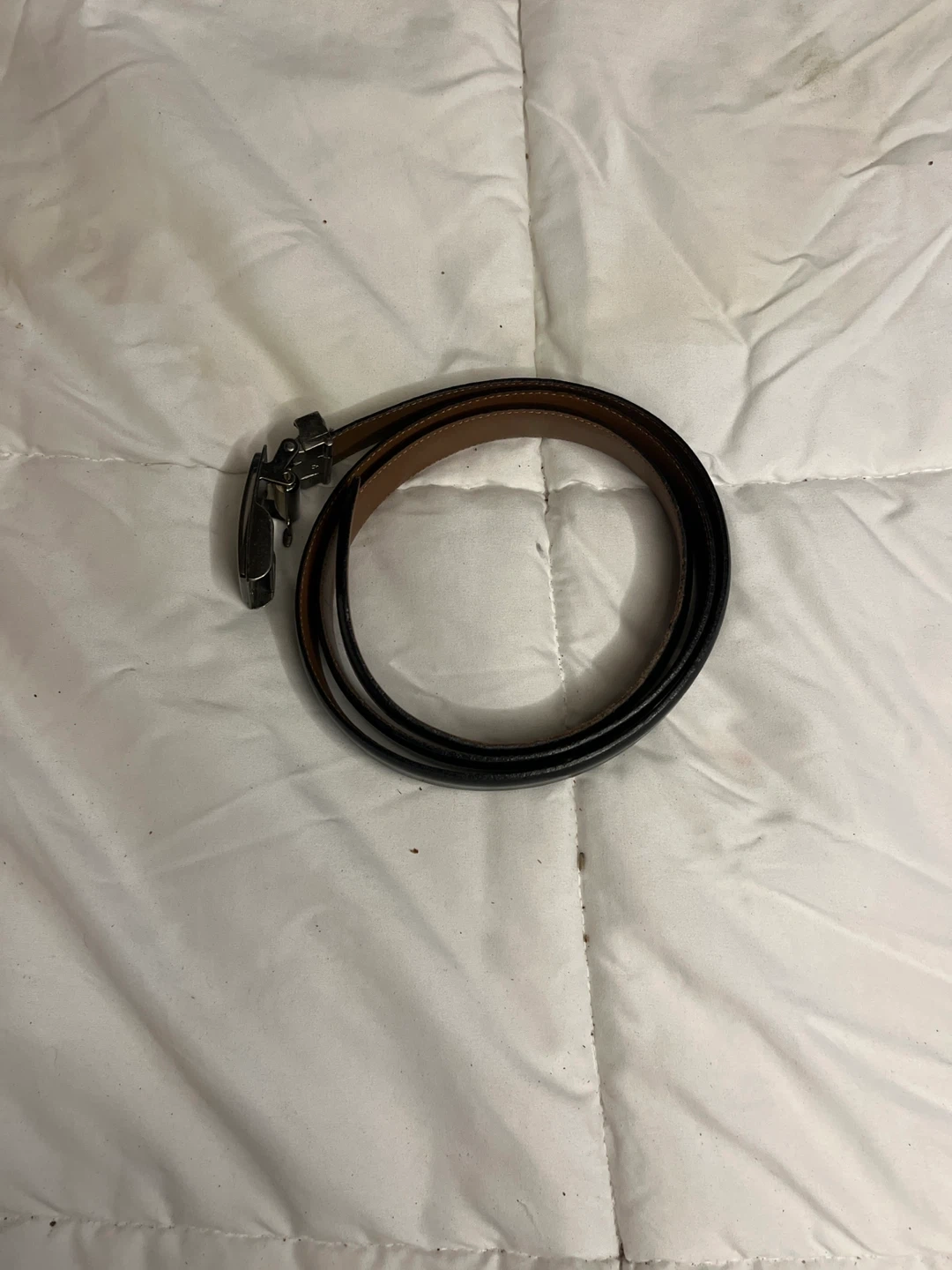 65Selling a sleek black leather belt! It features a silver buckle with a unique design. The belt is in great condition and ready to be worn. Perfect for adding a touch of style to any outfit!