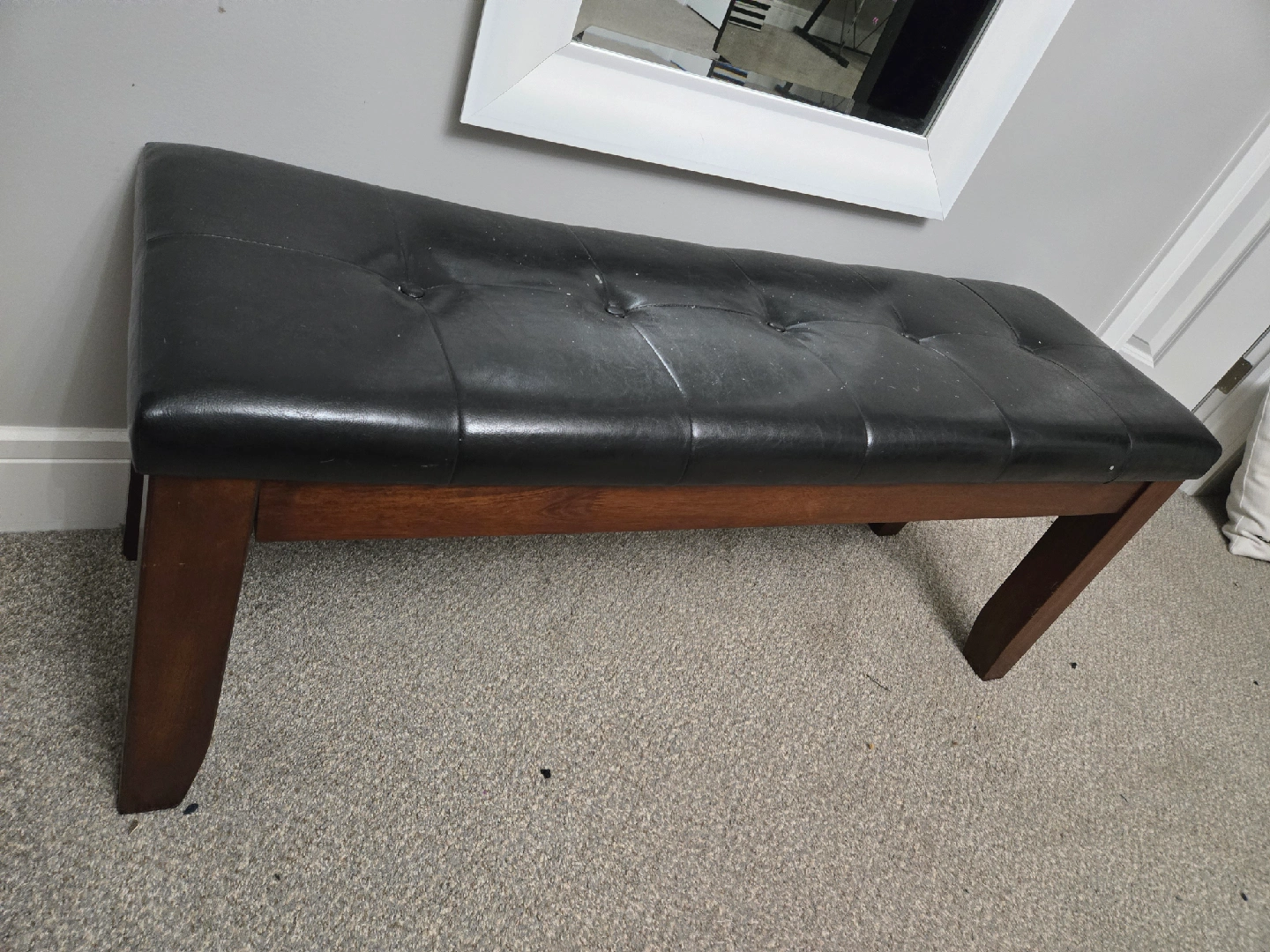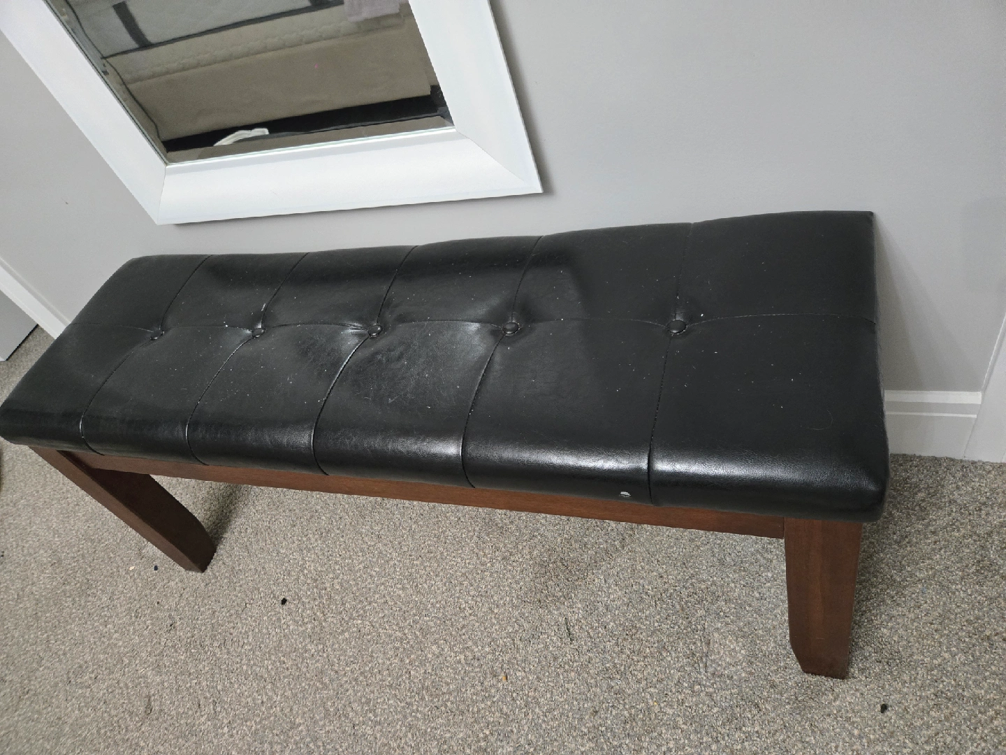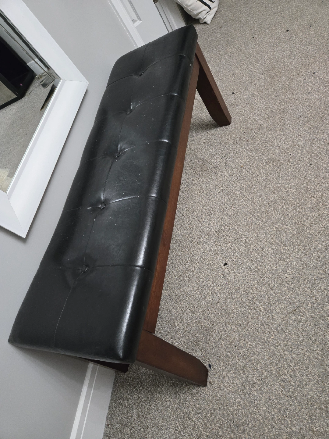 Selling a black leather bench. Please note that one back piece is broken and needs repair. It has a tufted top and wooden legs. with gentle repairs very useful