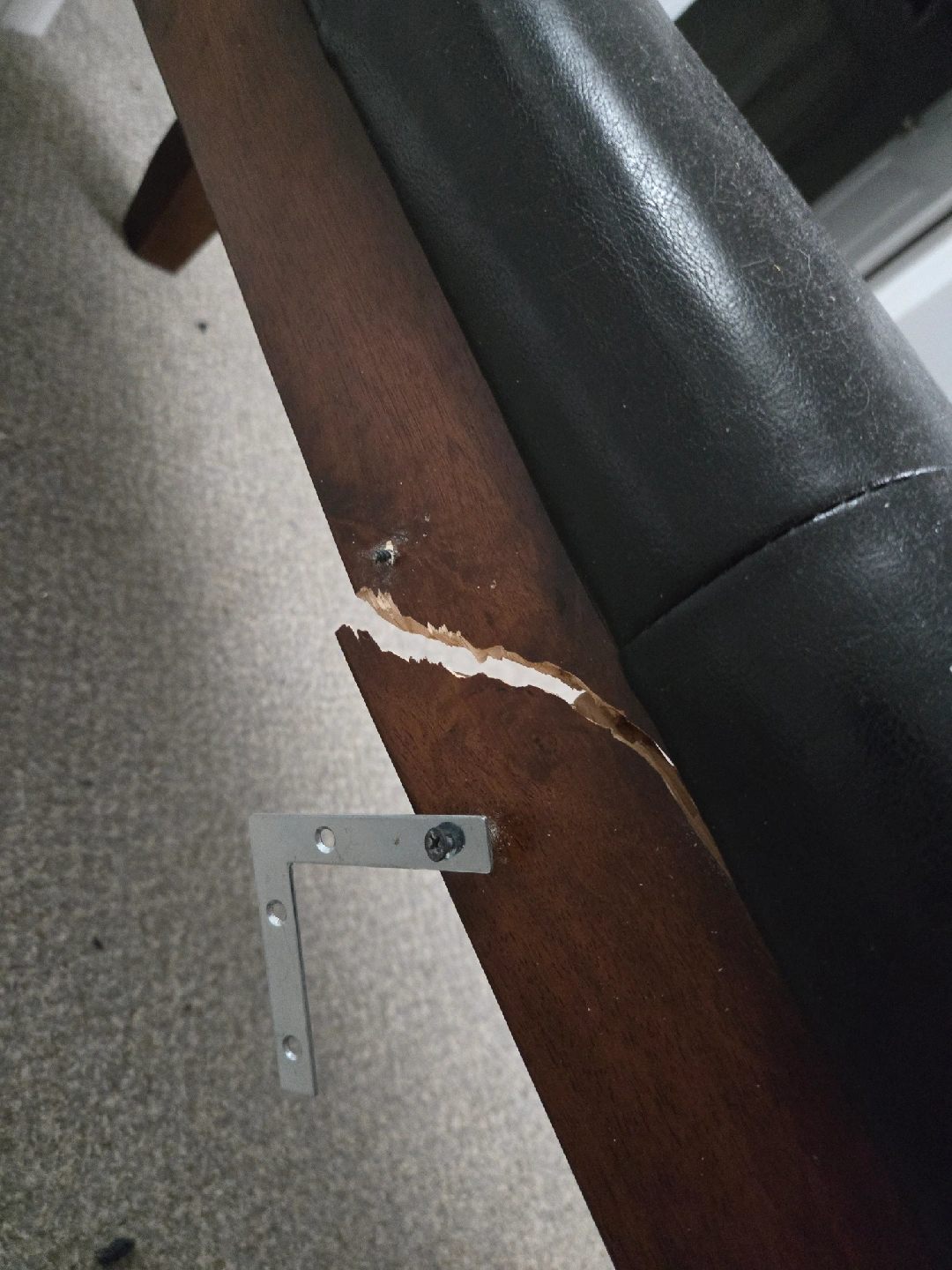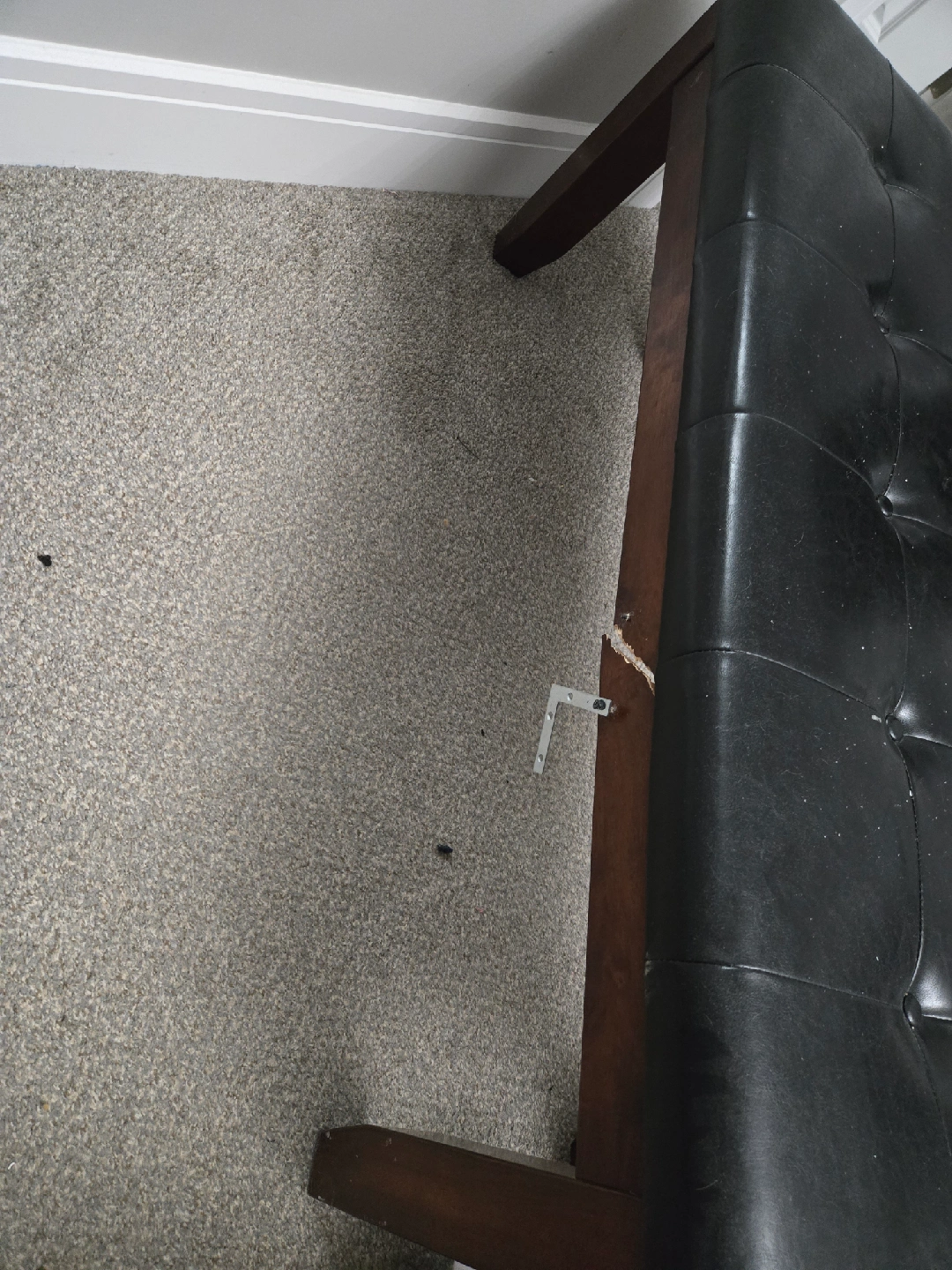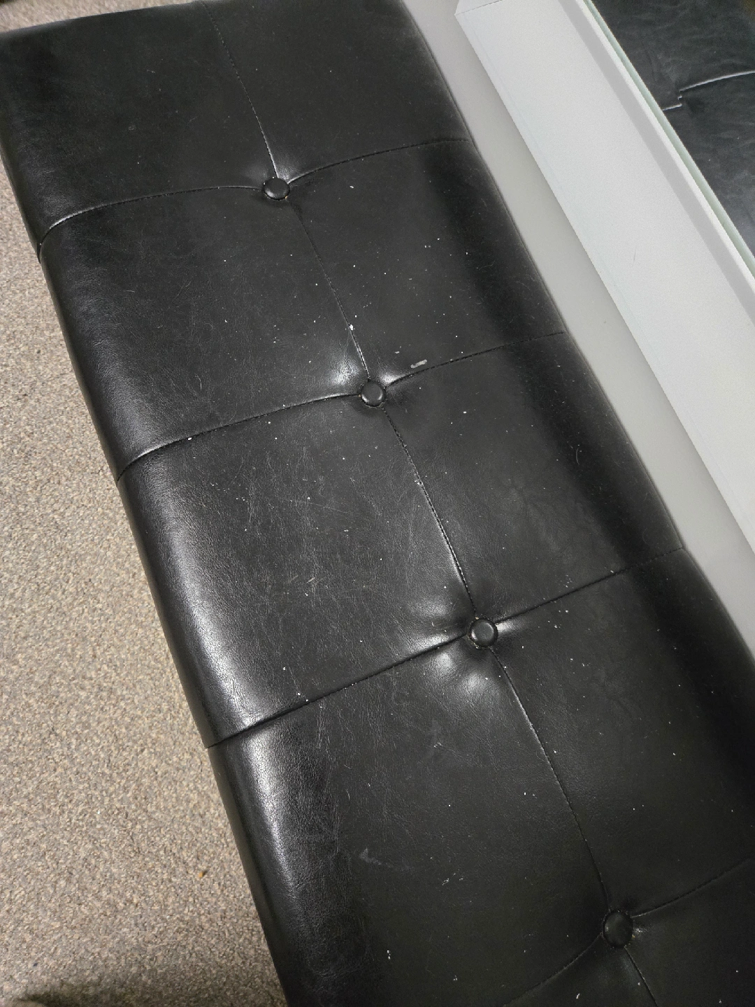 Selling a black leather bench. Please note that one back piece is broken and needs repair. It has a tufted top and wooden legs. with gentle repairs very useful