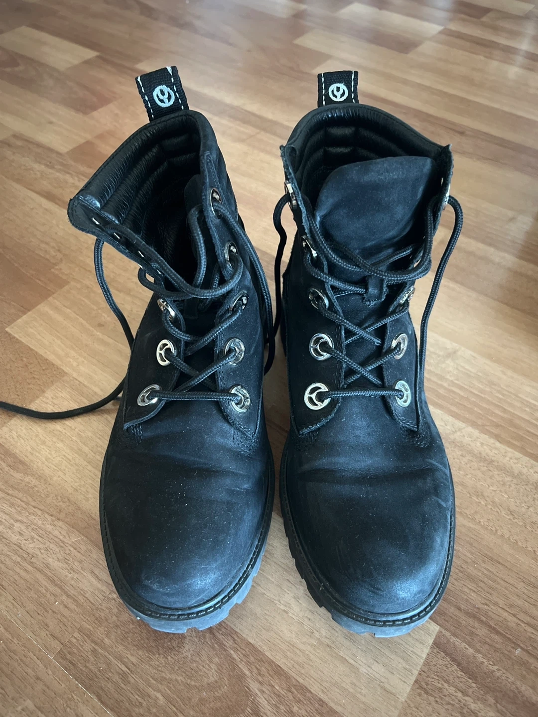 28Selling a pair of black leather boots. They are in good condition and perfect for everyday wear. The boots feature a lace-up design with silver eyelets and the Timberland logo on the tongue and side. They have some signs of wear but are still very durable and comfortable