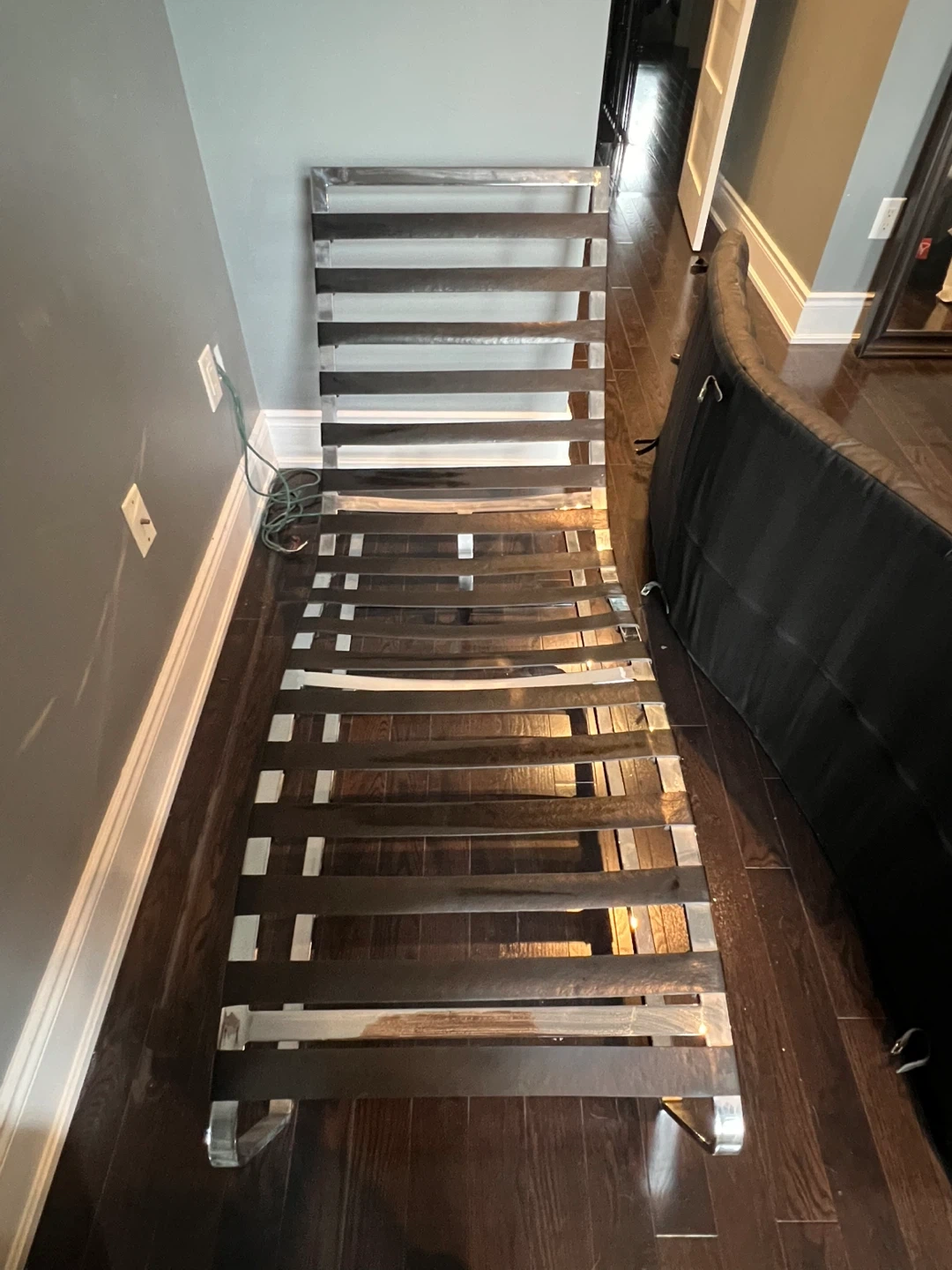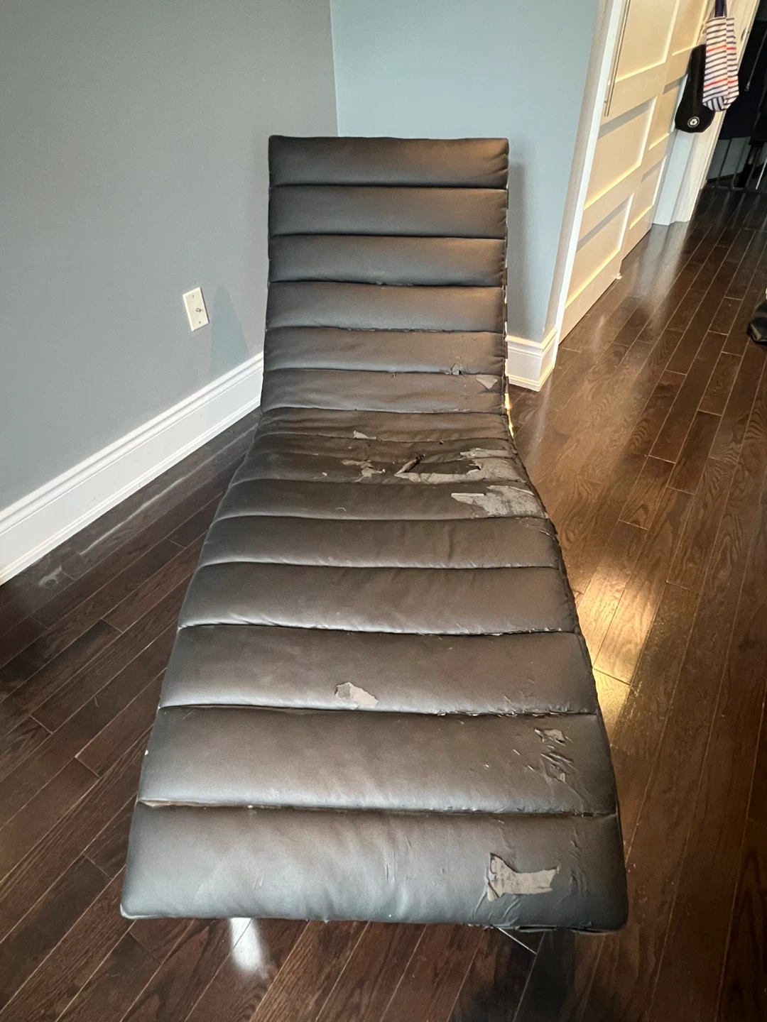 Selling a chaise lounge chair frame - for a project. Dimensions are 35" H x 24" W x 59" L. It has some wear and tear, as shown in the pictures. Cushion is faux leather. Foam in good condition. Straps on the frame is real leather. The chrome frame is in great condition.
