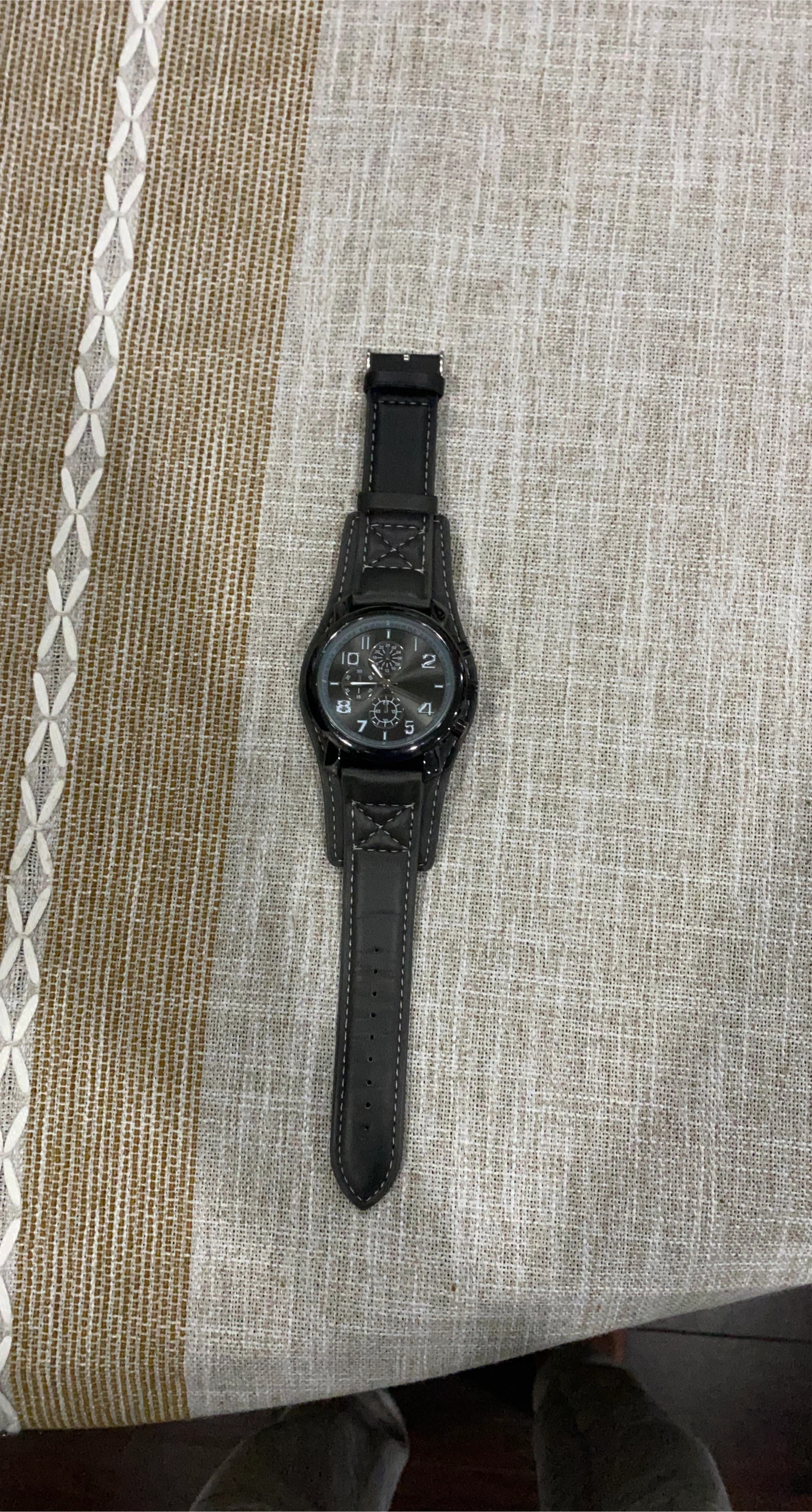 81Selling a stylish black leather cuff watch! It features a unique cuff design that adds a bold touch to any outfit. The watch has a black dial with clear numerals, making it easy to read the time. The leather band is comfortable and durable, perfect for everyday wear. A great accessory for any wardrobe!