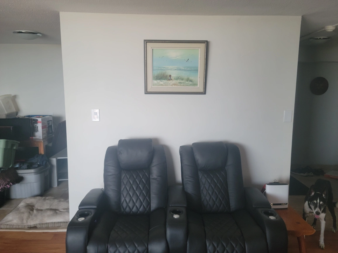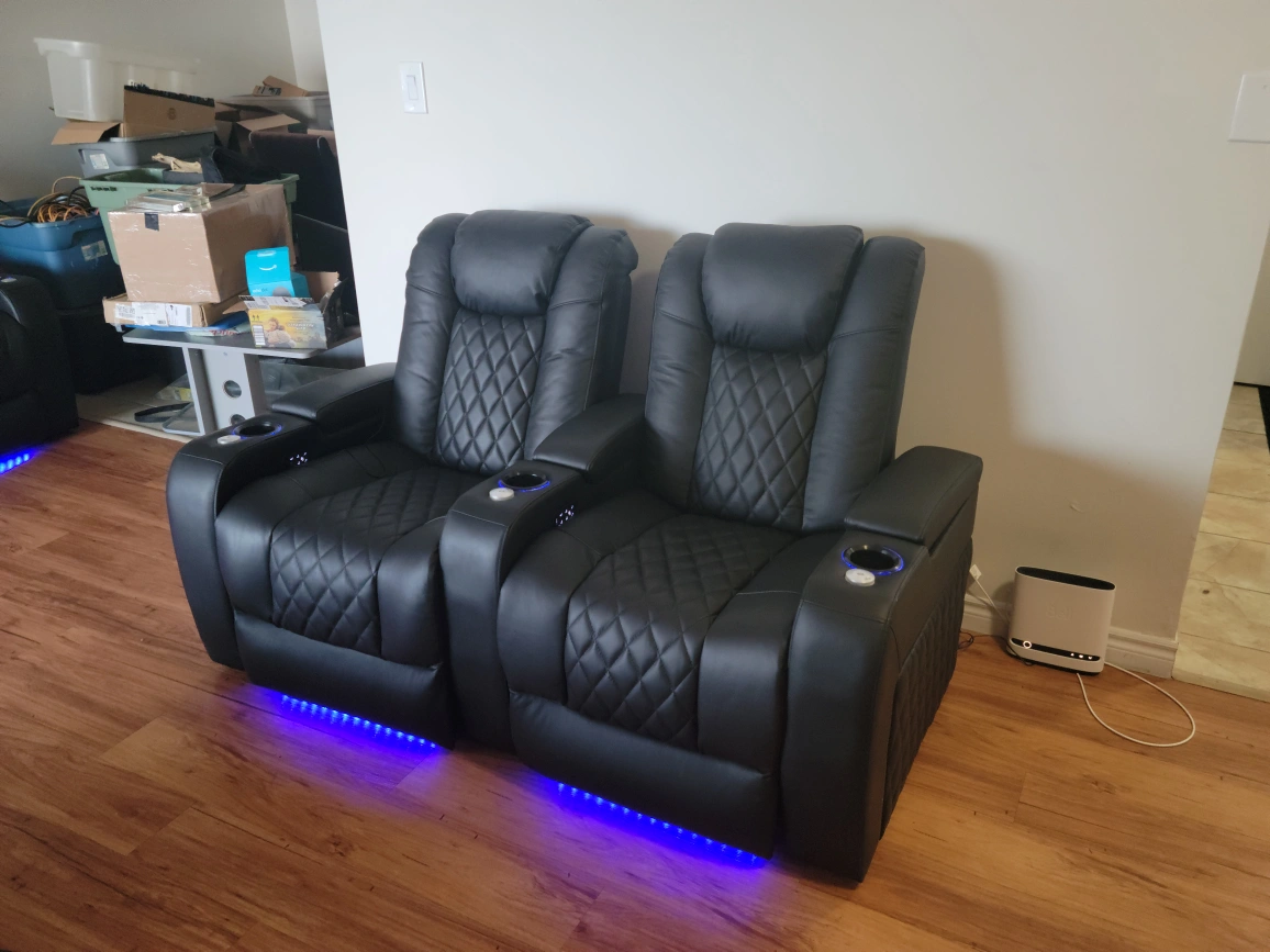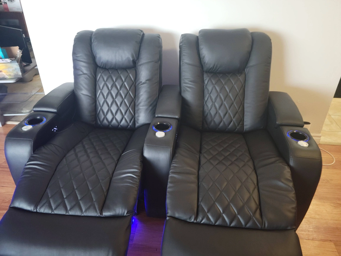Selling a pair of black leather home theatre reclining seats. They feature a diamond pattern on the seat and back, plus handy cup holders and LED lights. Perfect for movie nights!