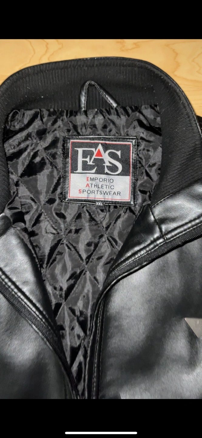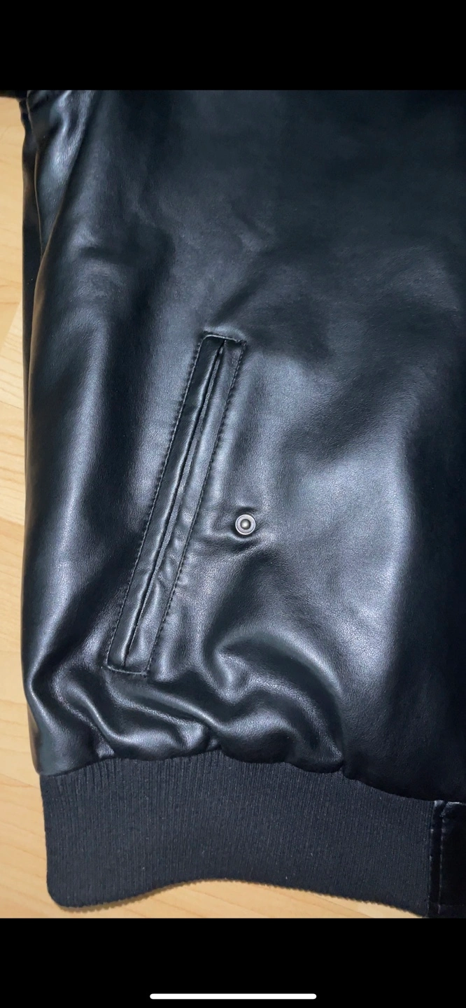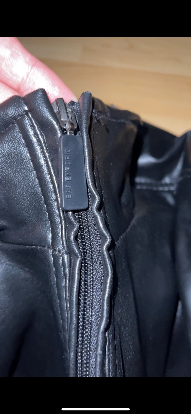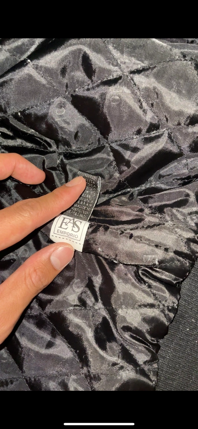 LUXURY BRAND✨ EMPORIO ARMANI Original Price: Ranging from $600-1000+. Please checkwebsite for reference. Condition: 8.3/10, (Just the small damage on wrist area, shown on the photos) Authentic✅ Selling it for a FAIRLY LOW PRICE because does not fit me anymore and doesnt suit my style. Black leather bomber jacket. Features a zipper closure and two front pockets. Ribbed cuffs and hem.