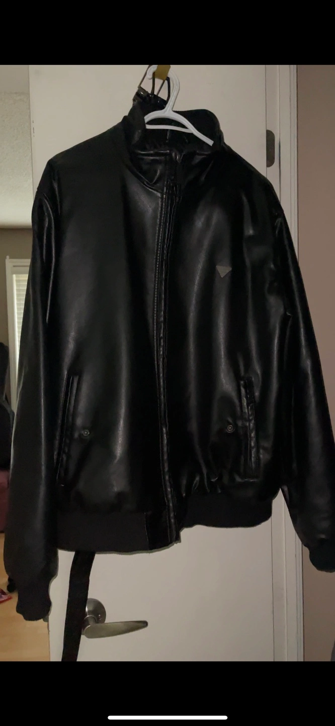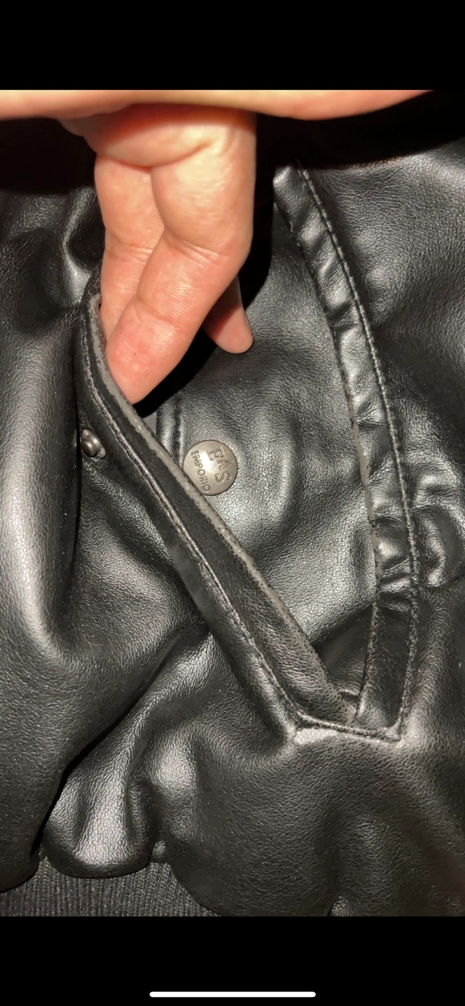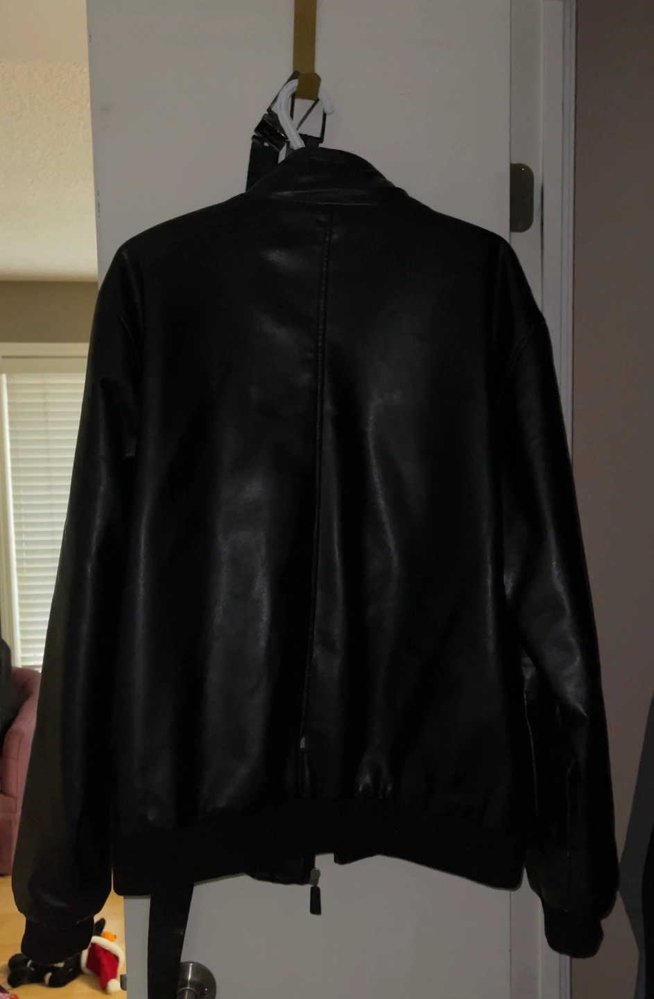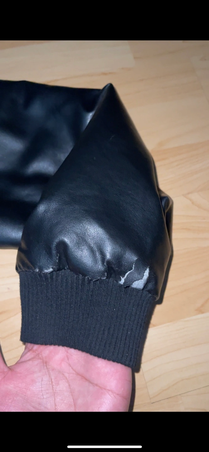 LUXURY BRAND✨ EMPORIO ARMANI Original Price: Ranging from $600-1000+. Please checkwebsite for reference. Condition: 8.3/10, (Just the small damage on wrist area, shown on the photos) Authentic✅ Selling it for a FAIRLY LOW PRICE because does not fit me anymore and doesnt suit my style. Black leather bomber jacket. Features a zipper closure and two front pockets. Ribbed cuffs and hem.