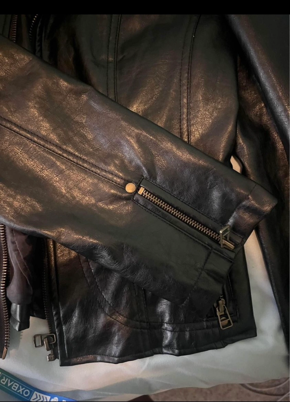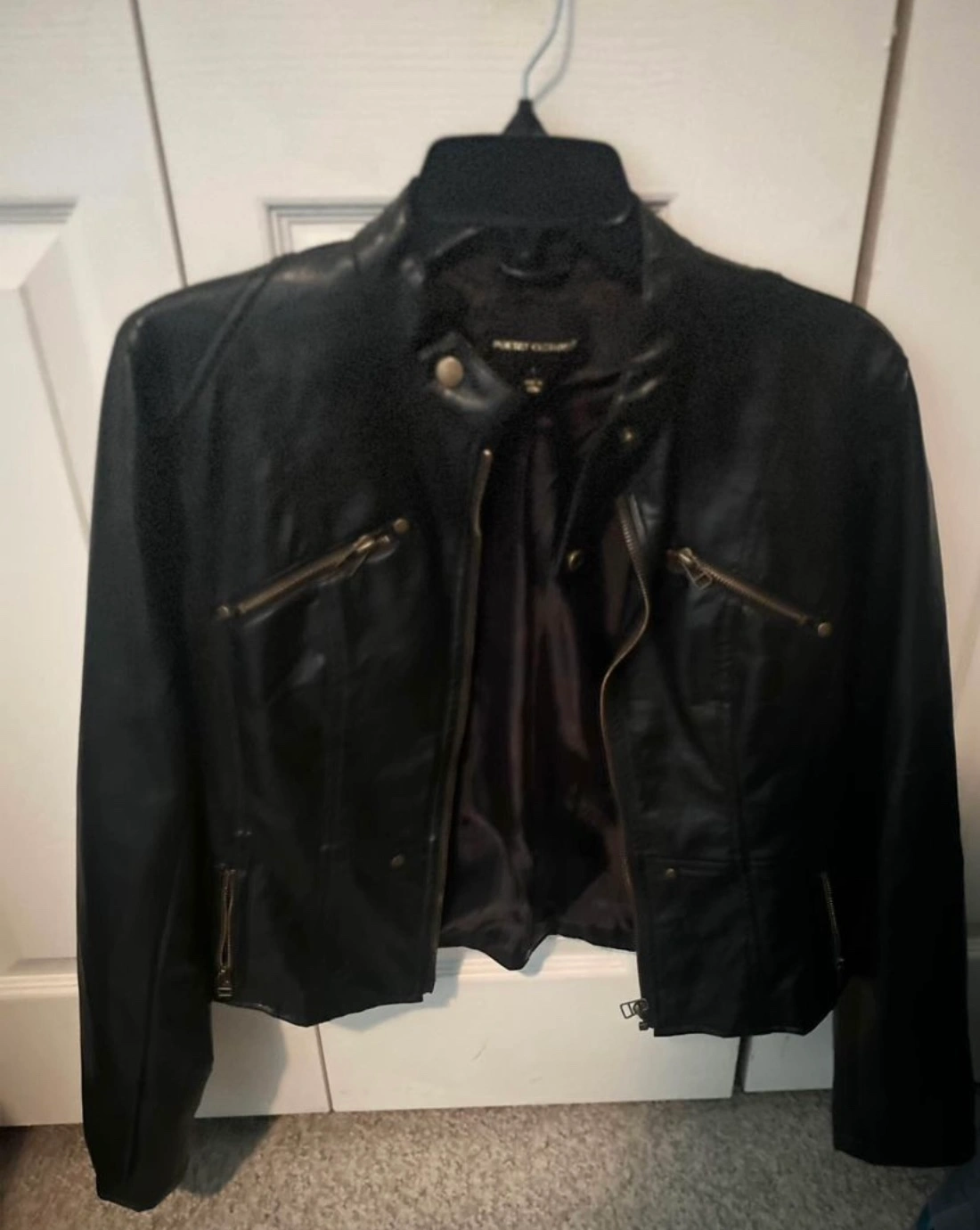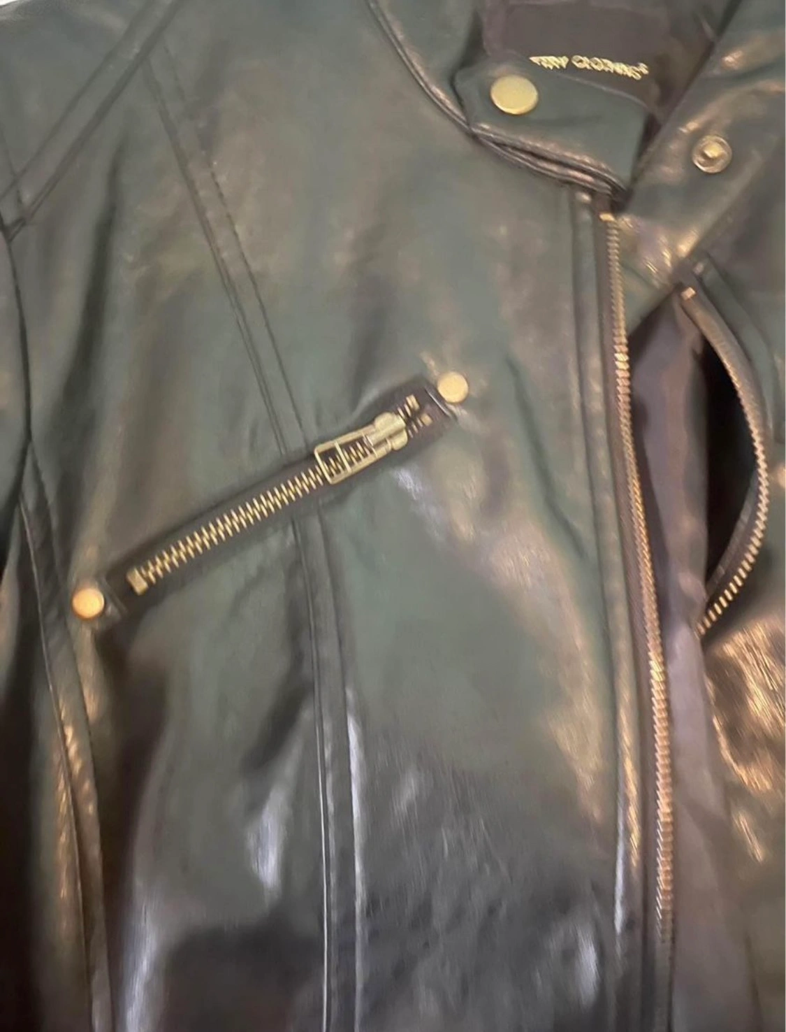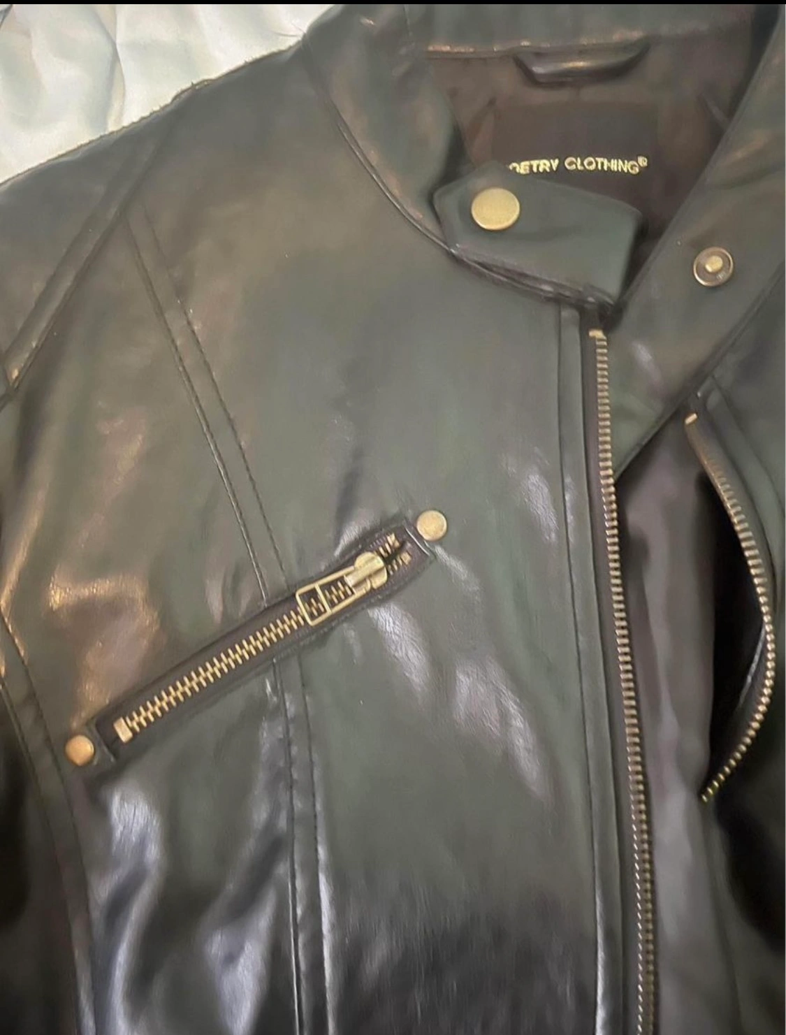 43Women's faux black leather jacket with gold accents. Size large but can fit small or medium