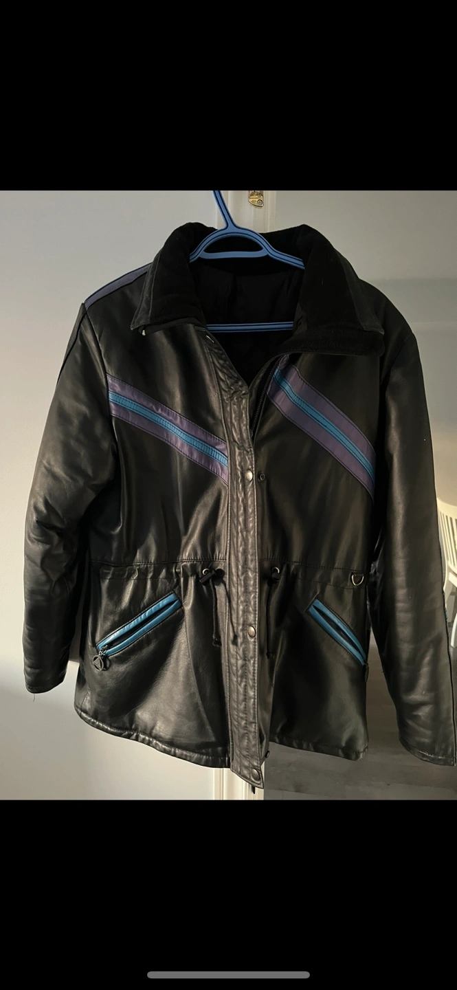 27Women's black leather jacket. Features blue and purple accents. Zipper closure. Drawstring waist. Multiple pockets. 3M insulate.