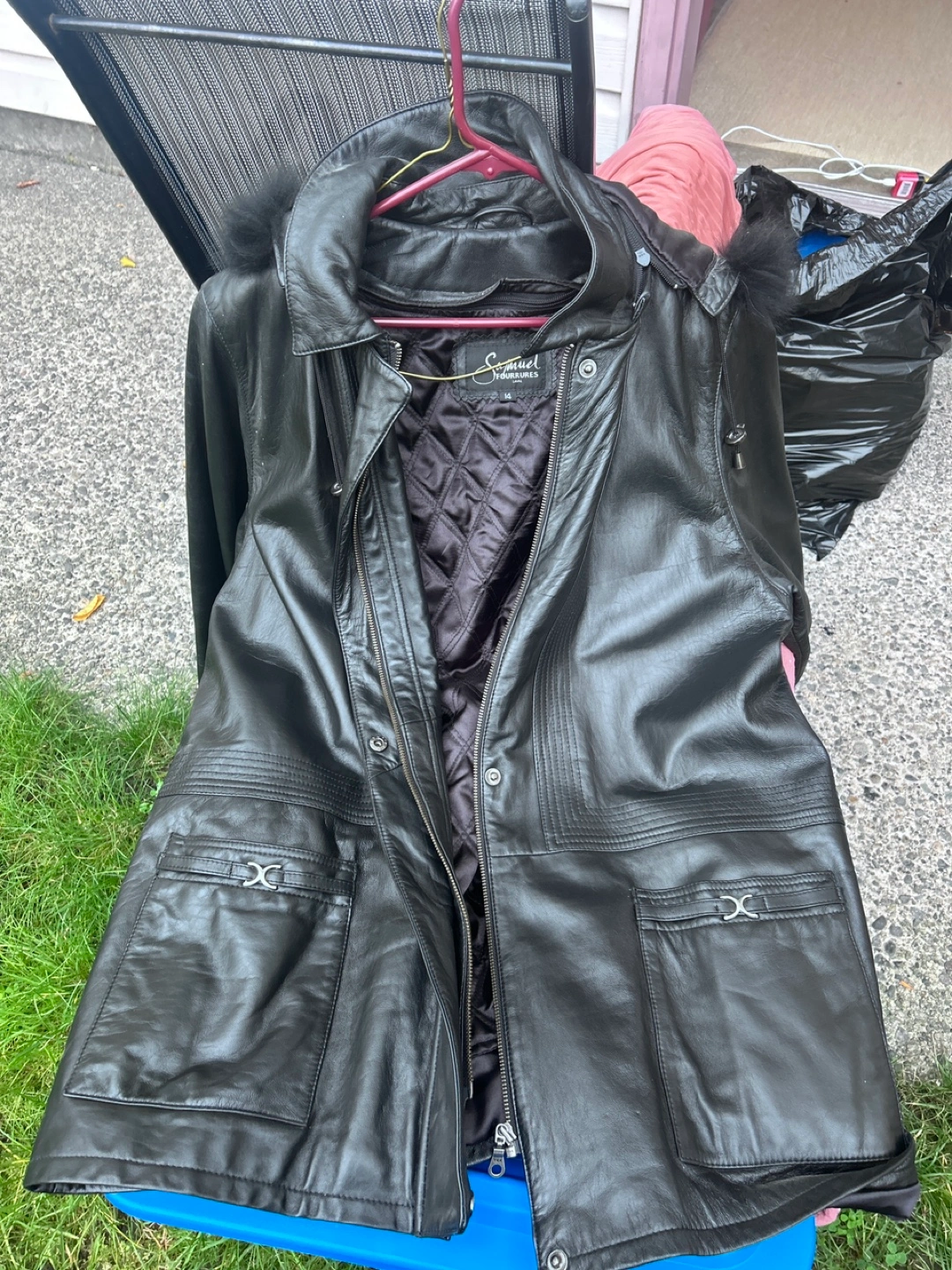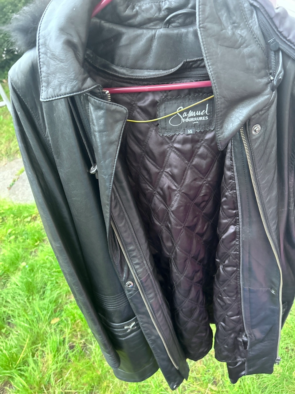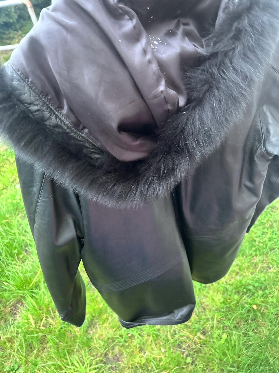 100Black leather jacket with a fur hood. Zipper closure and multiple pockets. Lined with quilted fabric. Belt and figure fitting.