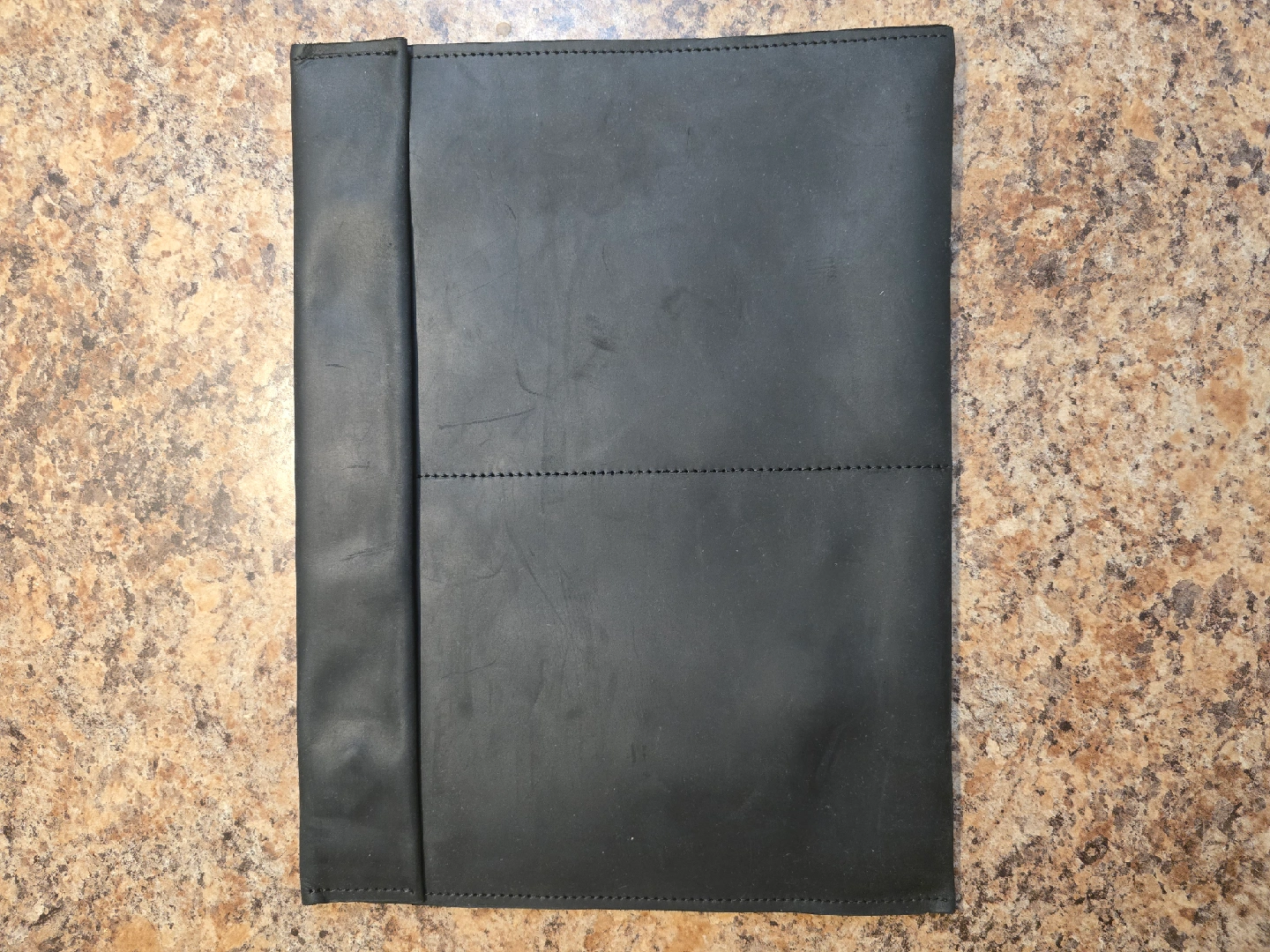 Selling a black leather Laptop sleeve. It's in great condition! It has a sleek and professional look, ideal for meetings or everyday use. Also features two pockets and a magnetic clasp