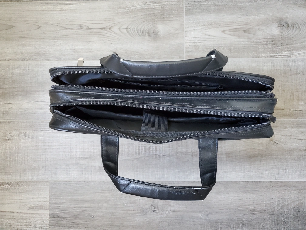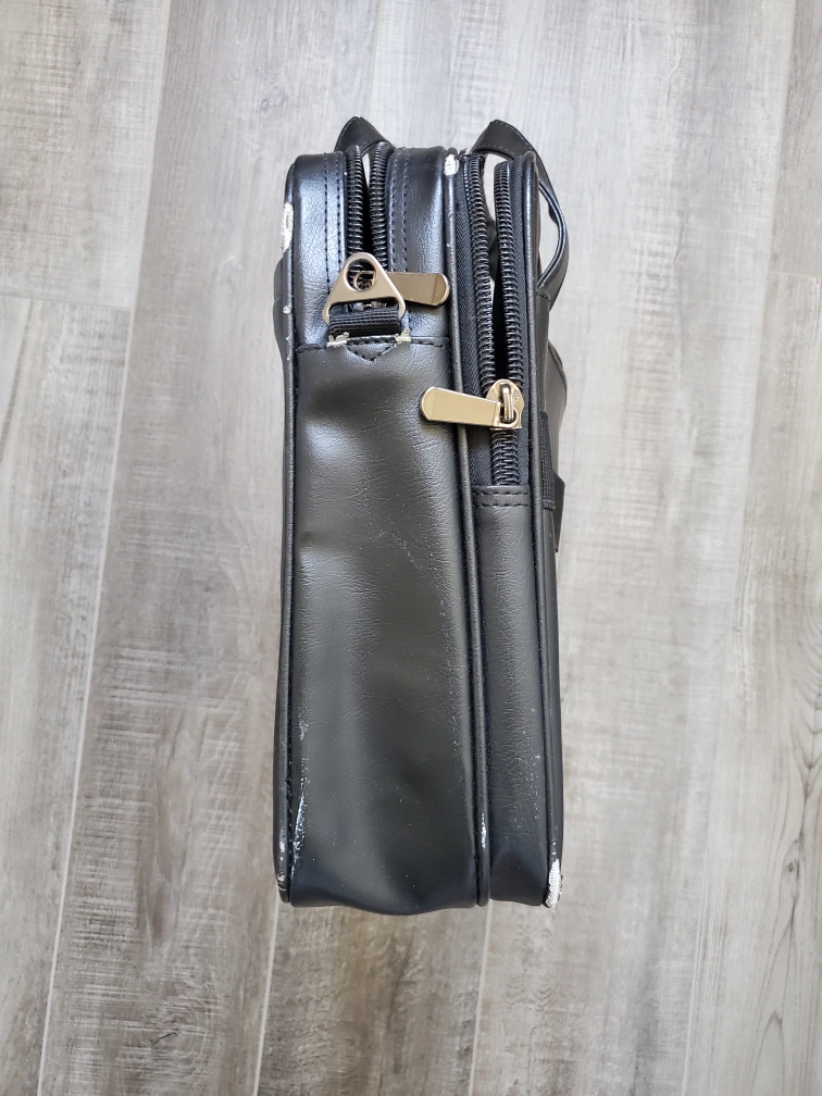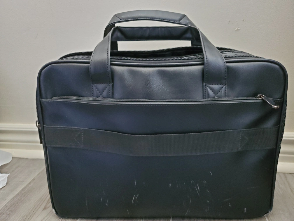 Selling a black briefcase with a leather-look finish. It features multiple compartments and zippers for organization. There are some signs of wear, as shown in the photos. Dimensions: Length - 16.5" Width - 3" Height - 12"