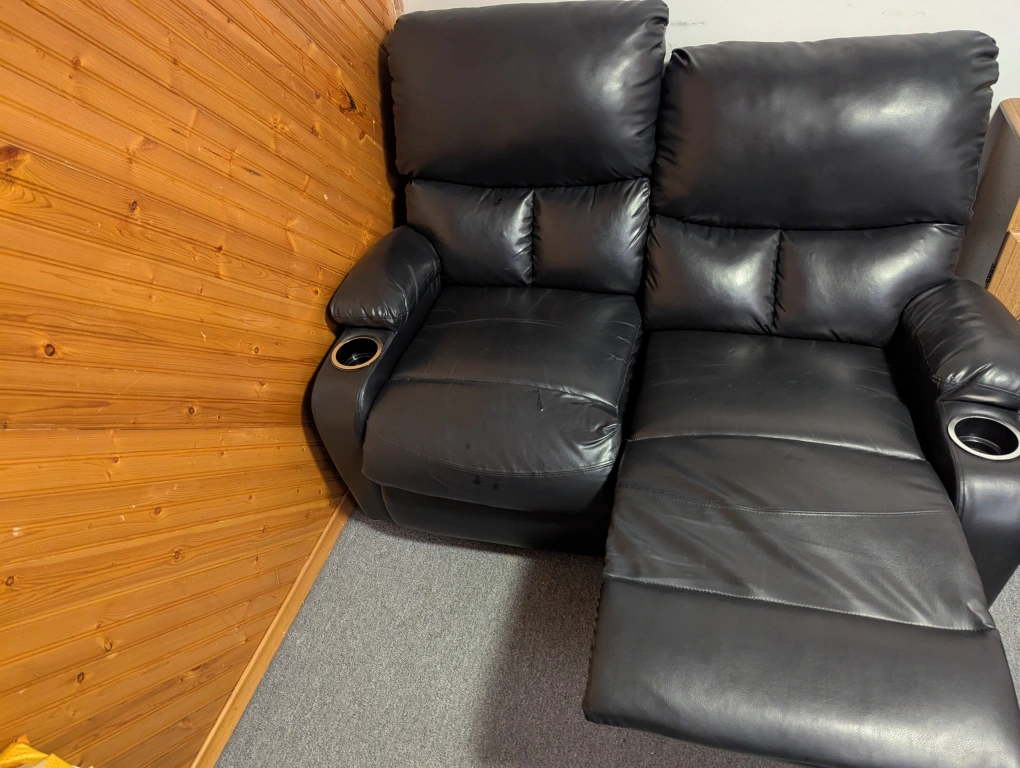 Selling a black leather loveseat recliner. It features built-in cupholders for your convenience. There are some signs of wear and tear on the leather, as shown in the photos, but it's still very comfortable and functional.