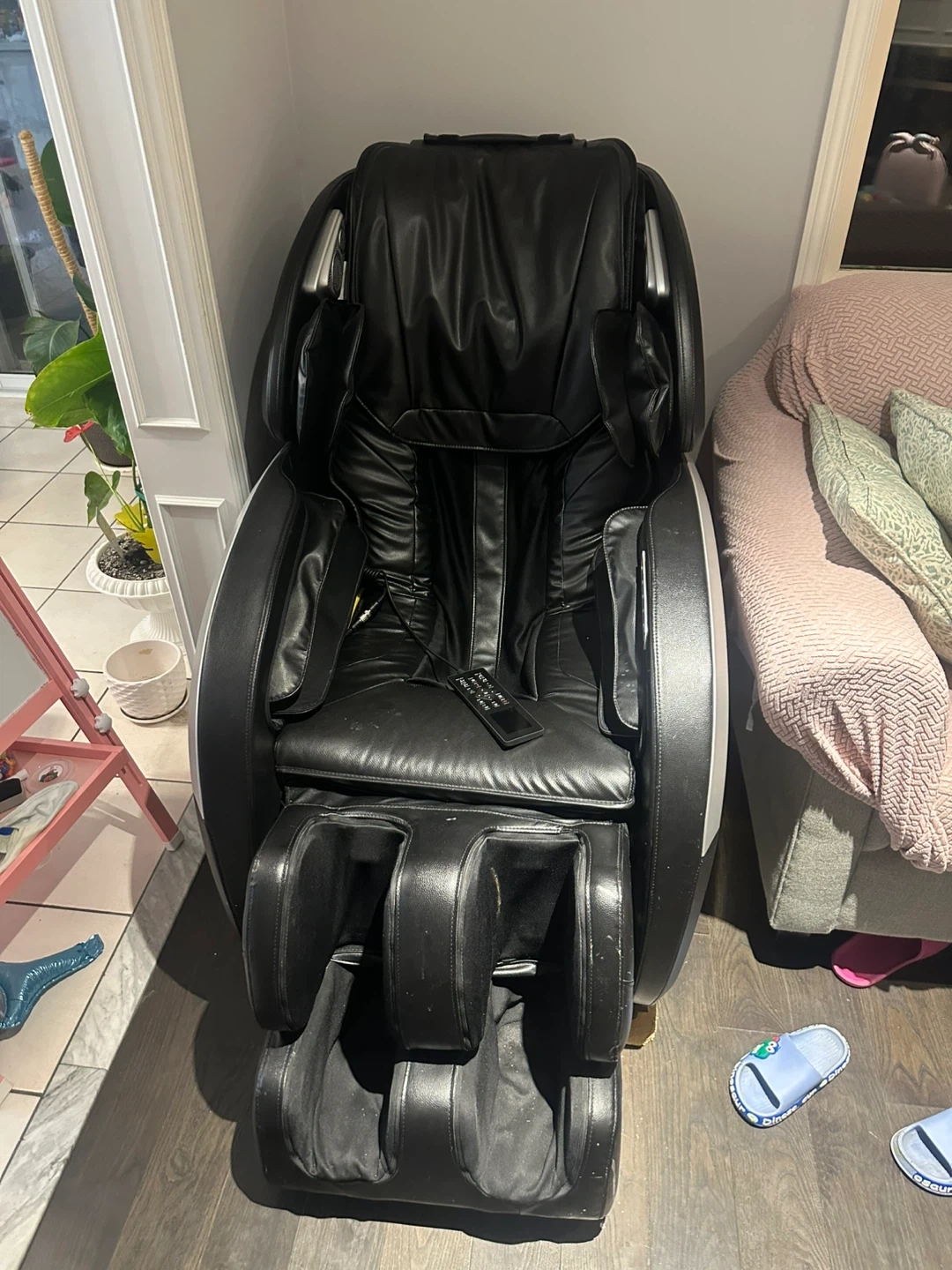 Selling a black leather massage chair! It's in good condition and ready to help you relax after a long day. Perfect for unwinding in the comfort of your own home