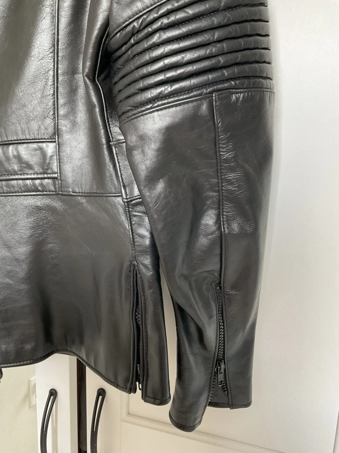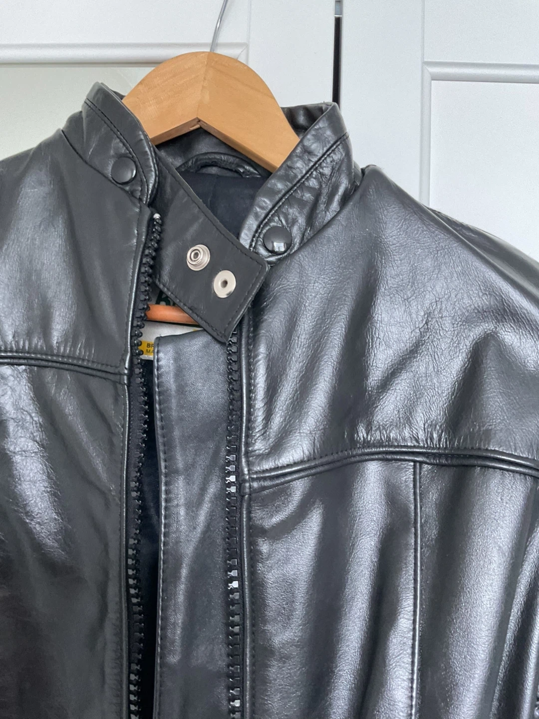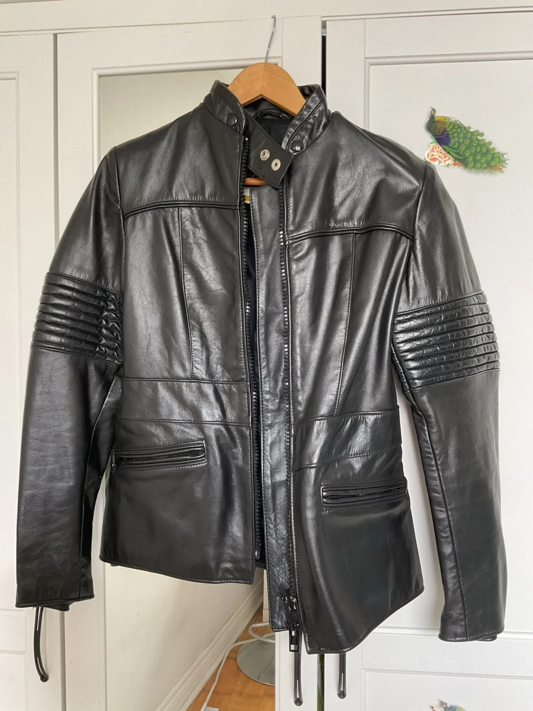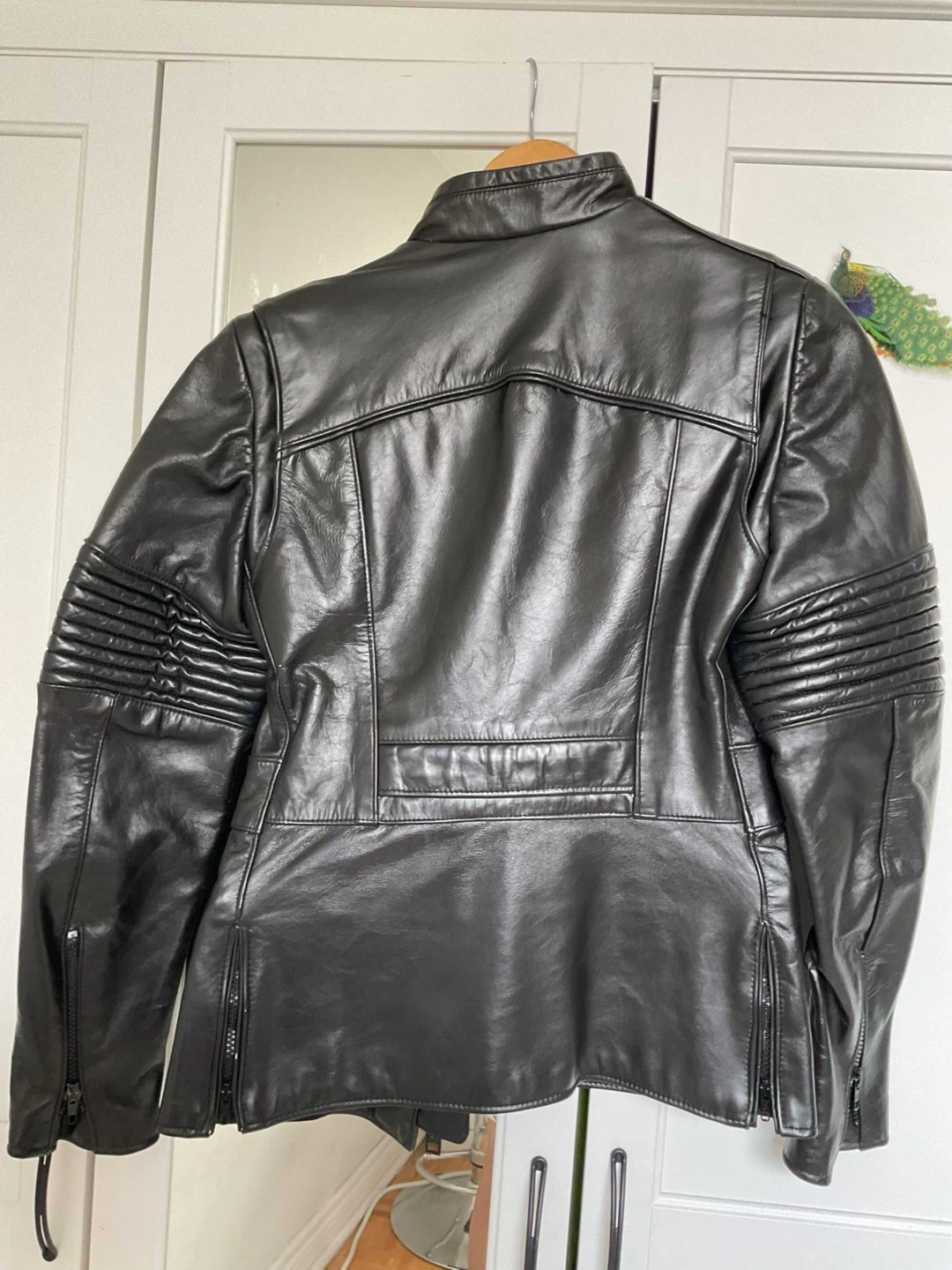 1000+Selling a sleek black leather motorcycle jacket. It's in great condition and ready for the road! The jacket features a classic design with detailed stitching and zippered accents. Perfect for adding a touch of edge to your wardrobe!