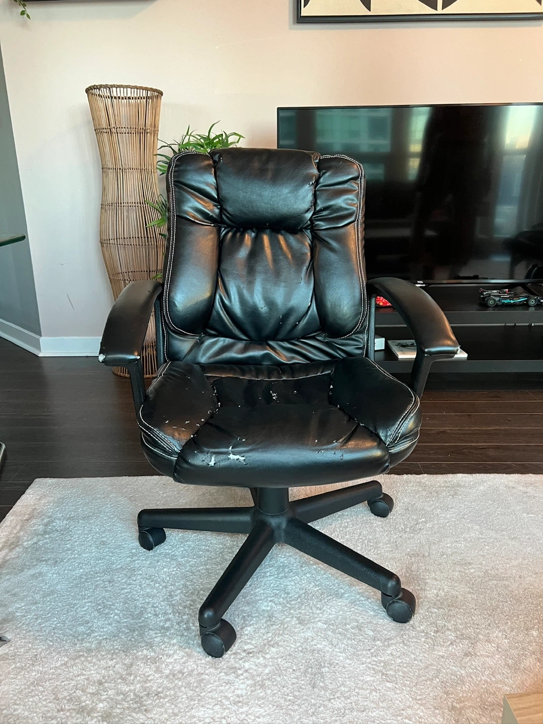 132Selling a black leather office chair. It has some wear and tear on the seat, as shown in the photos but still a very comfortable chair for your home office and everything works perfectly well. Originally bought for $220.