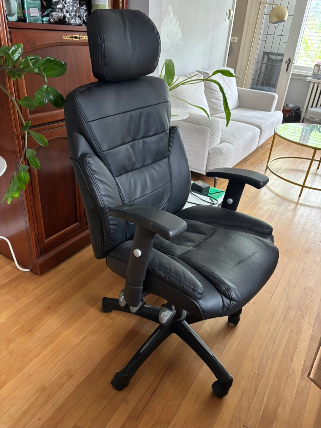 306Selling a black leather office chair. It has a headrest and adjustable armrests. It shows some signs of use. ❗️🌼 please check my other listings, you might find something interesting to buy and make the best of your time.