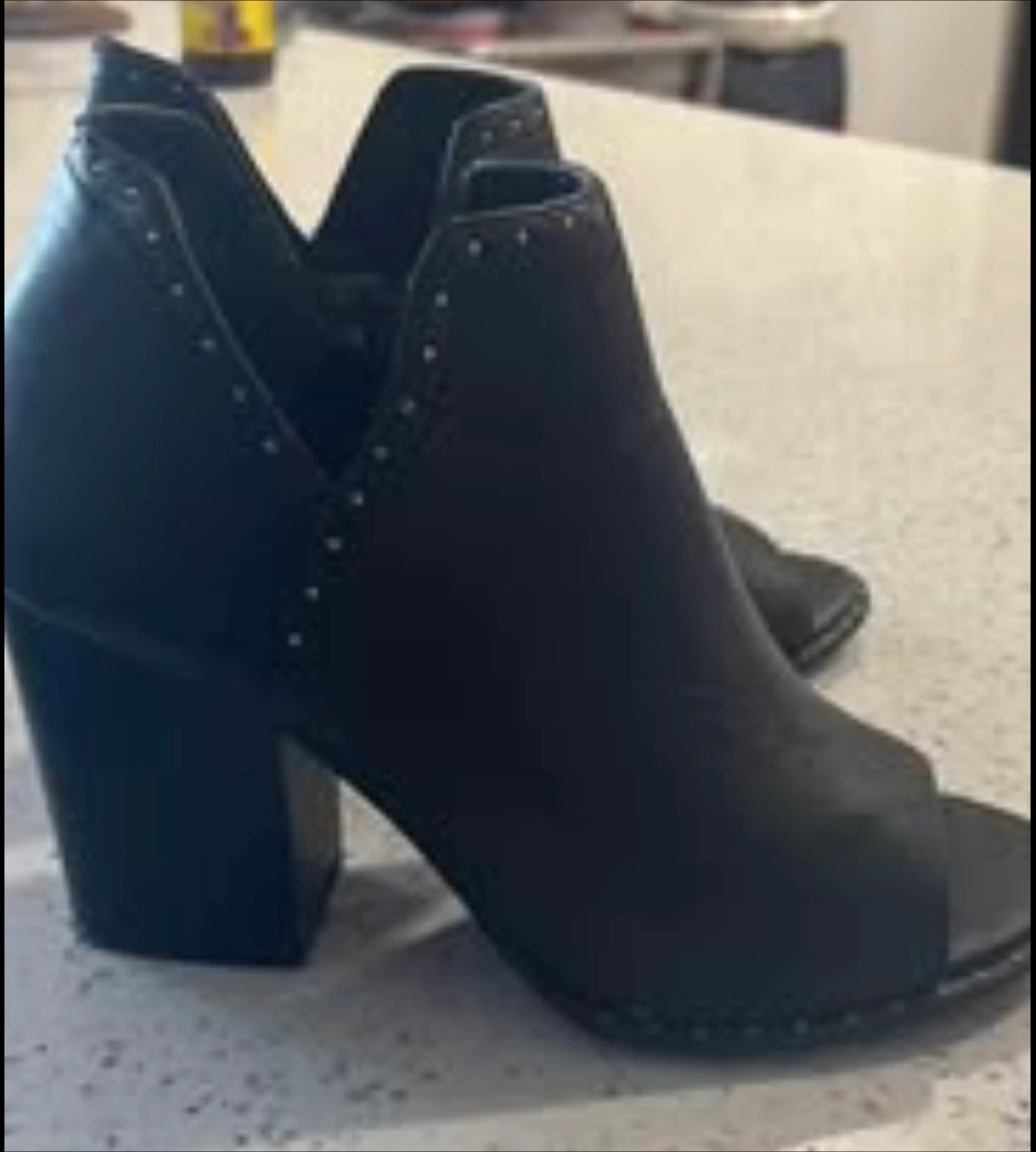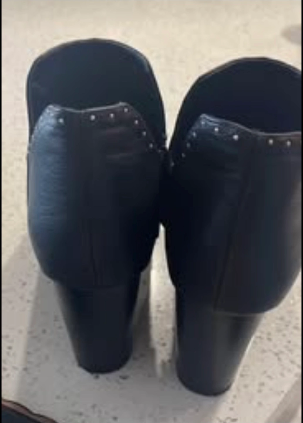 27Stylish black leather booties. Peep-toe design. Block heel. Metal stud detailing. Great for fall and winter.