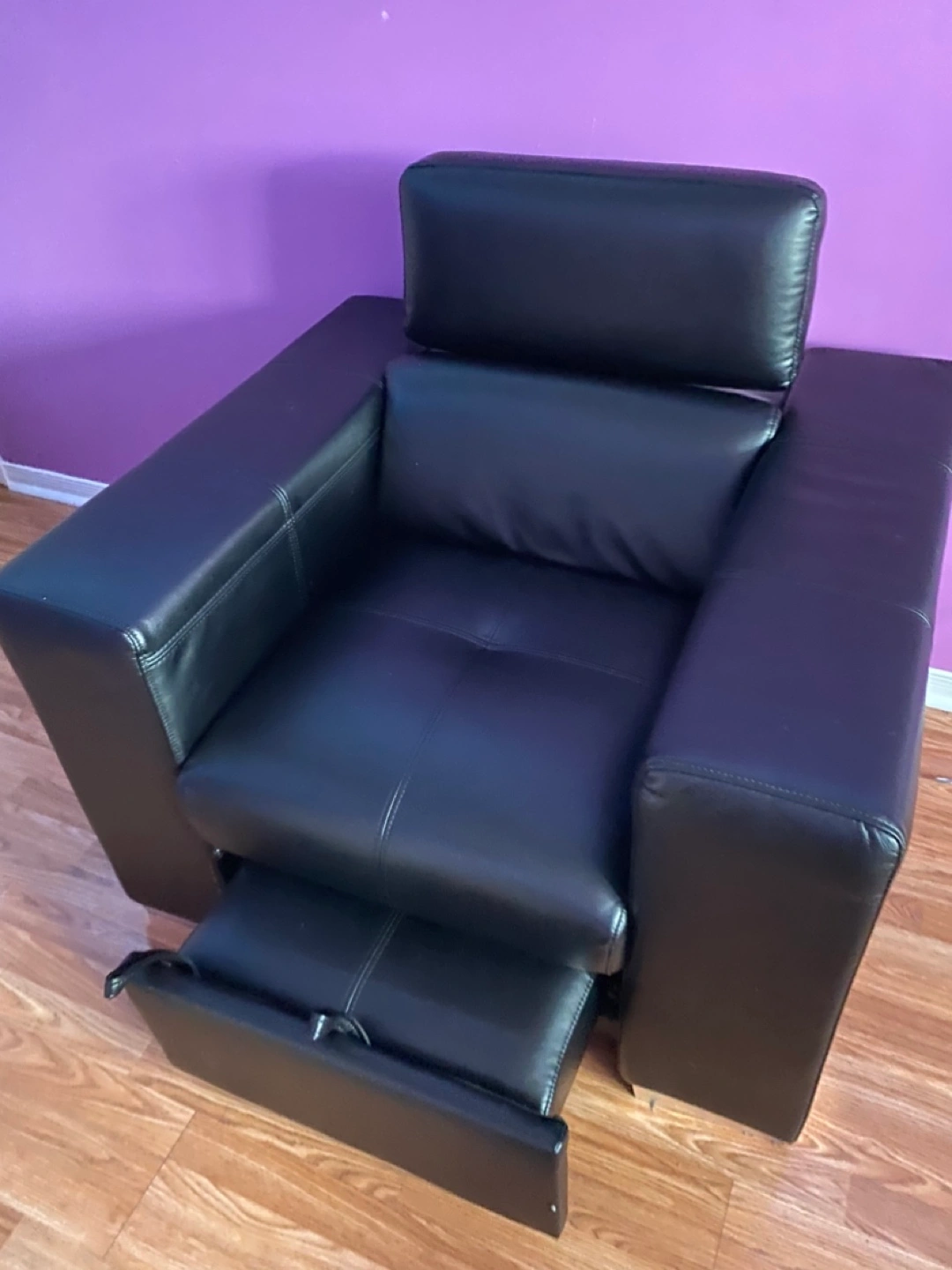 Moving another city … bought only 3 months Selling a comfy black leather armchair with a built-in recliner. It's in great shape and perfect for relaxing after a long day. The recliner function works smoothly. It would look great in any living room or den!