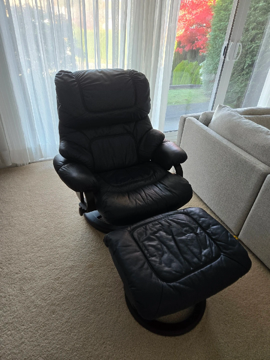 10Selling a comfy black leather recliner chair that comes with a matching ottoman! It's perfect for relaxing after a long day. The chair is in good condition and has a smooth reclining mechanism. It would be a great addition to any living room or den!