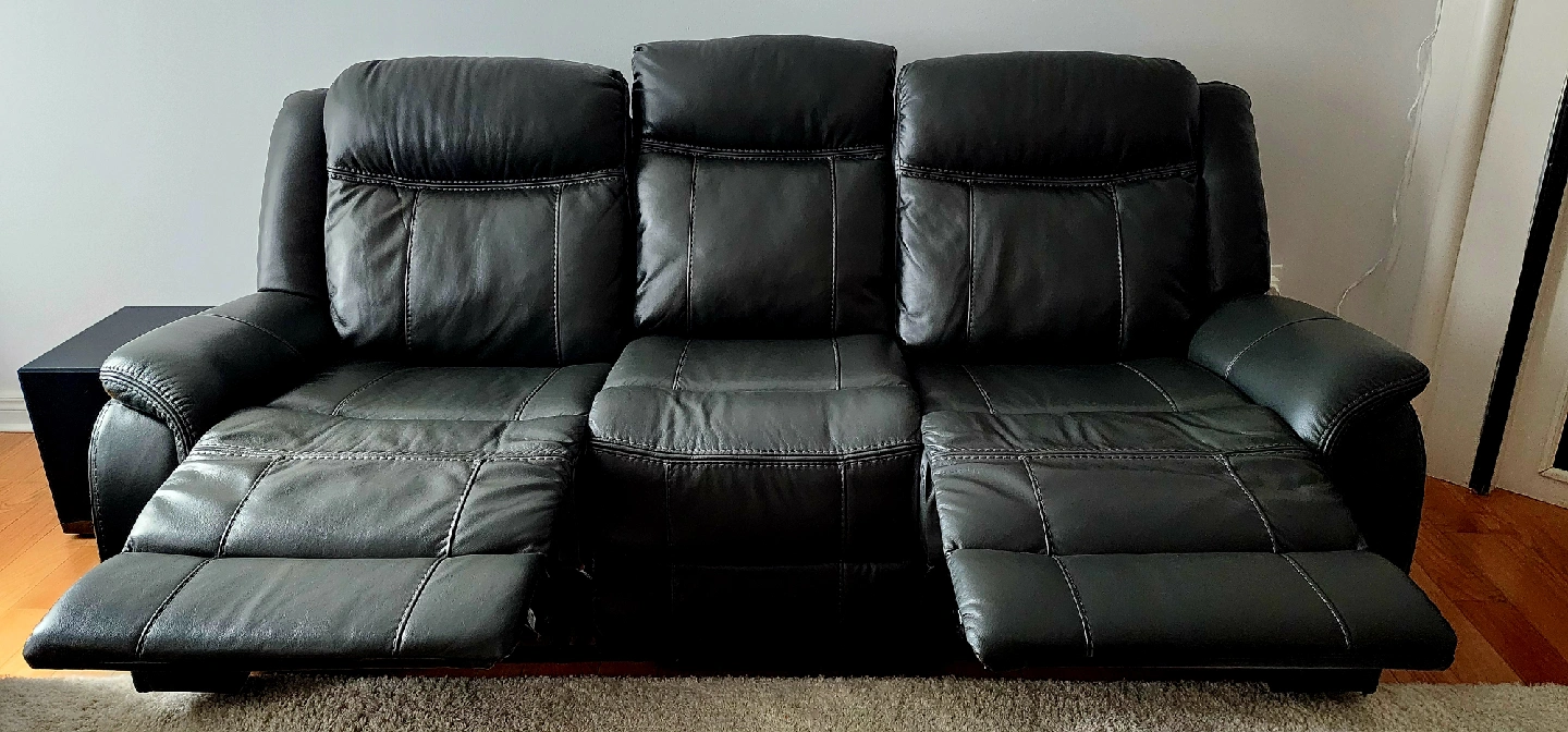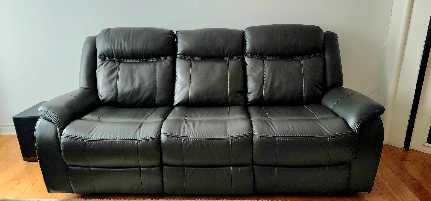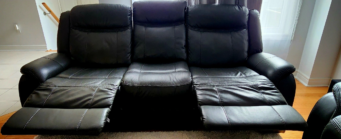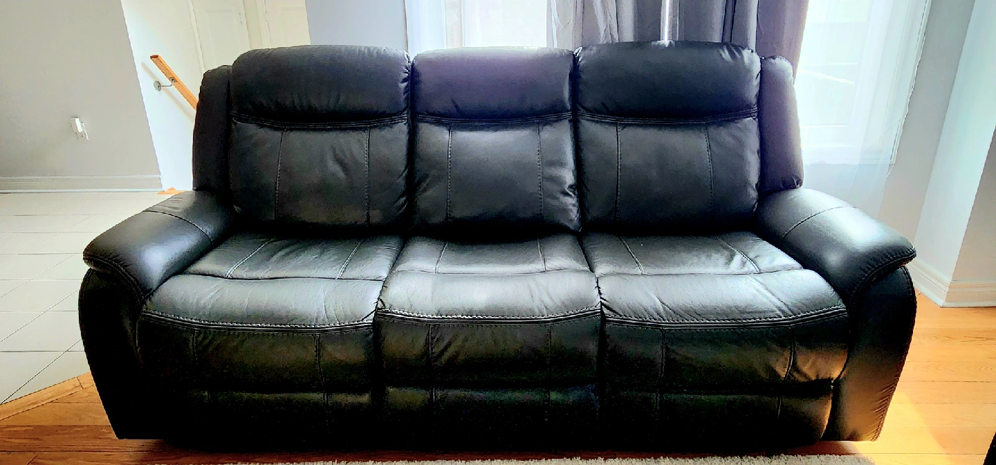 Selling a comfortable black leather reclining two sofas! It's in good condition and would be a great addition to any living room or entertainment space. Perfect for relaxing after a long day or enjoying movie nights with friends and family. The reclining feature adds an extra level of comfort. These are two sofas. each sofas is for $500