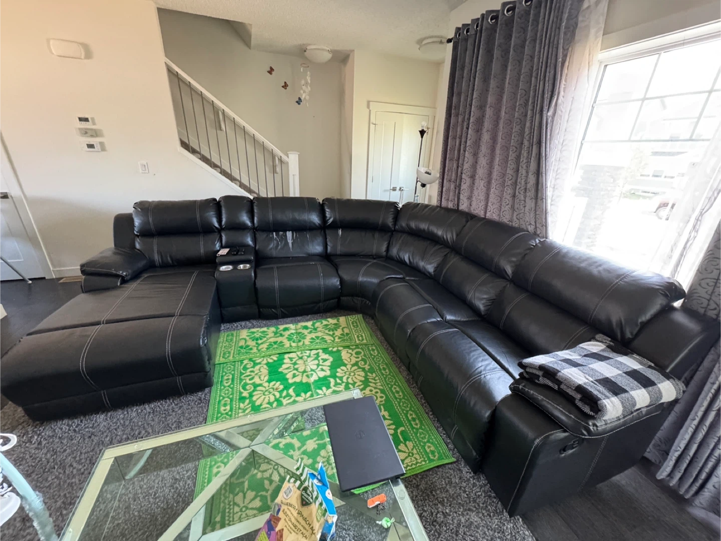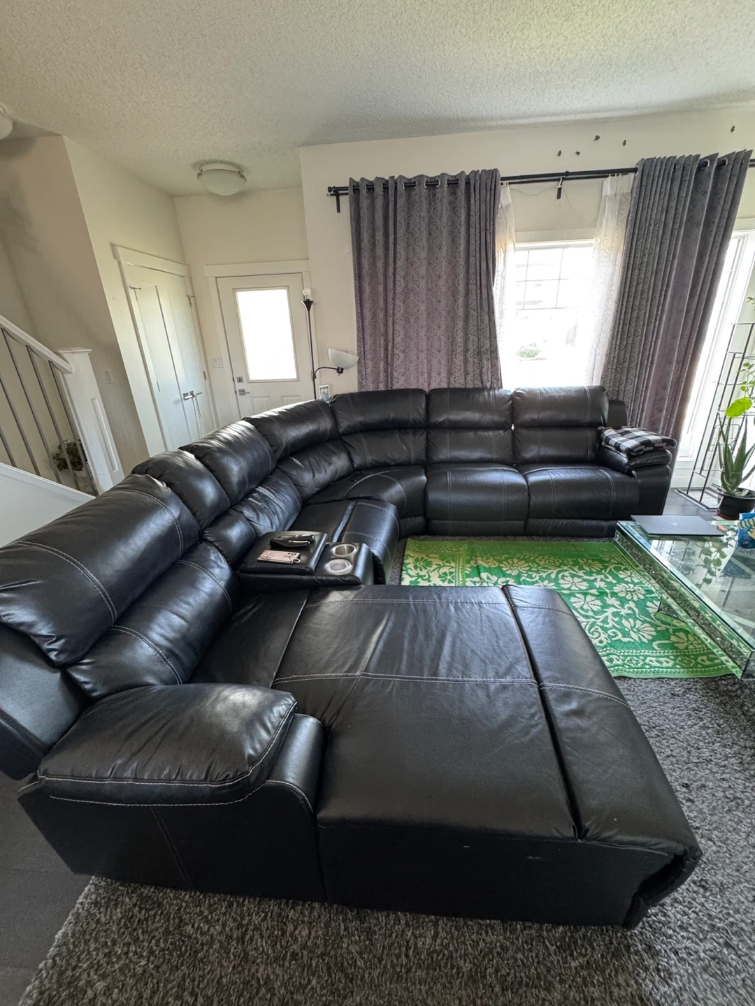 60Selling a spacious black leather sectional sofa! It's in great condition and would be perfect for a living room or entertainment area. It features a comfortable chaise lounge and built-in cup holders. Also have reclining.