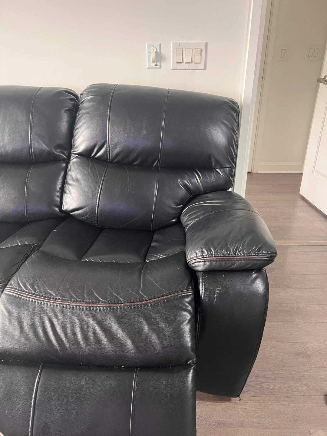 10Selling a black leather sectional sofa. It shows signs of wear, as seen in the photos. It could be a great fit for someone looking for a large, comfortable couch at a reasonable price.