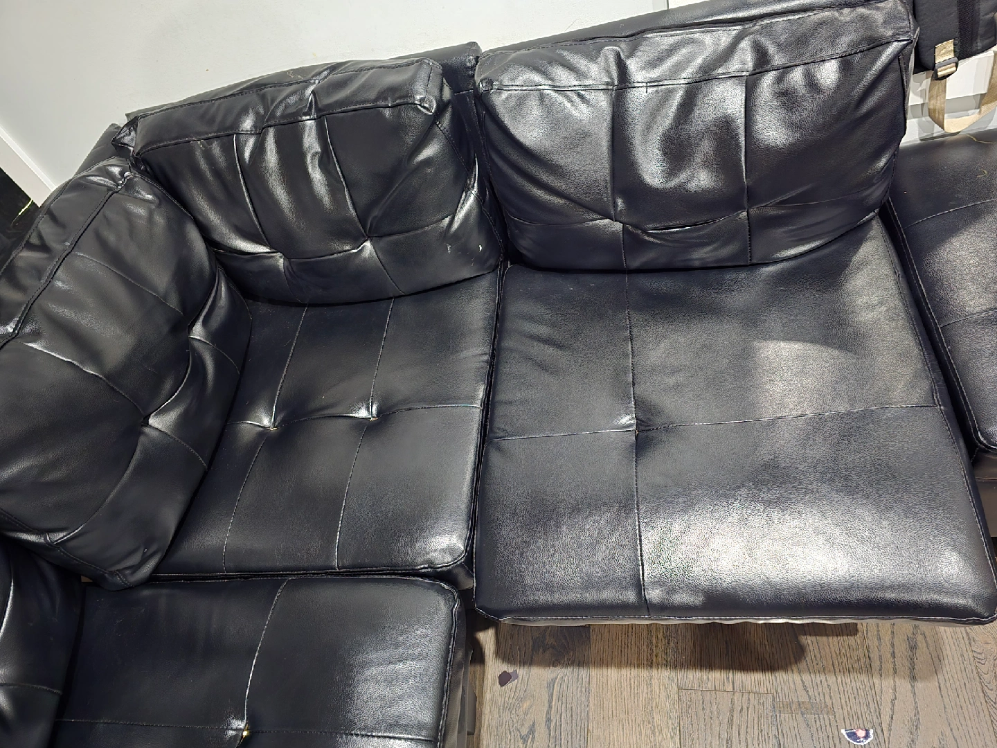 Selling a black leather sectional sofa. It features a chaise lounge and a built-in console with cupholders. It's a great piece for a living room or entertainment area. There are some signs of wear, but overall it's in good condition and ready for a new home Not a single scratch on it