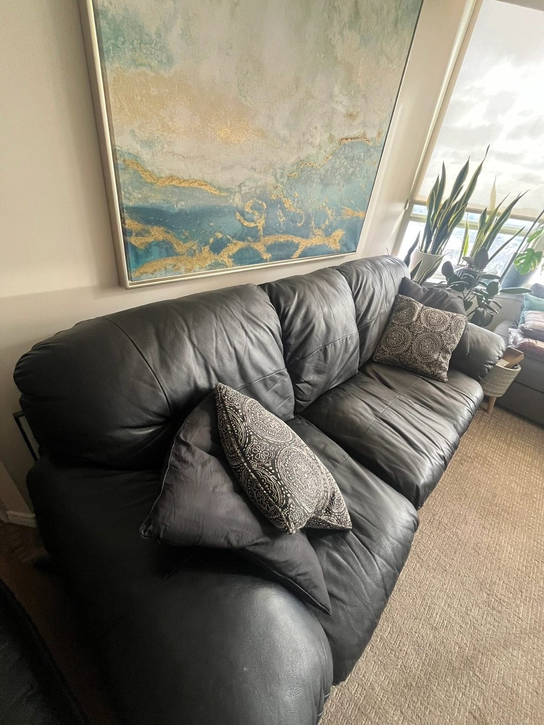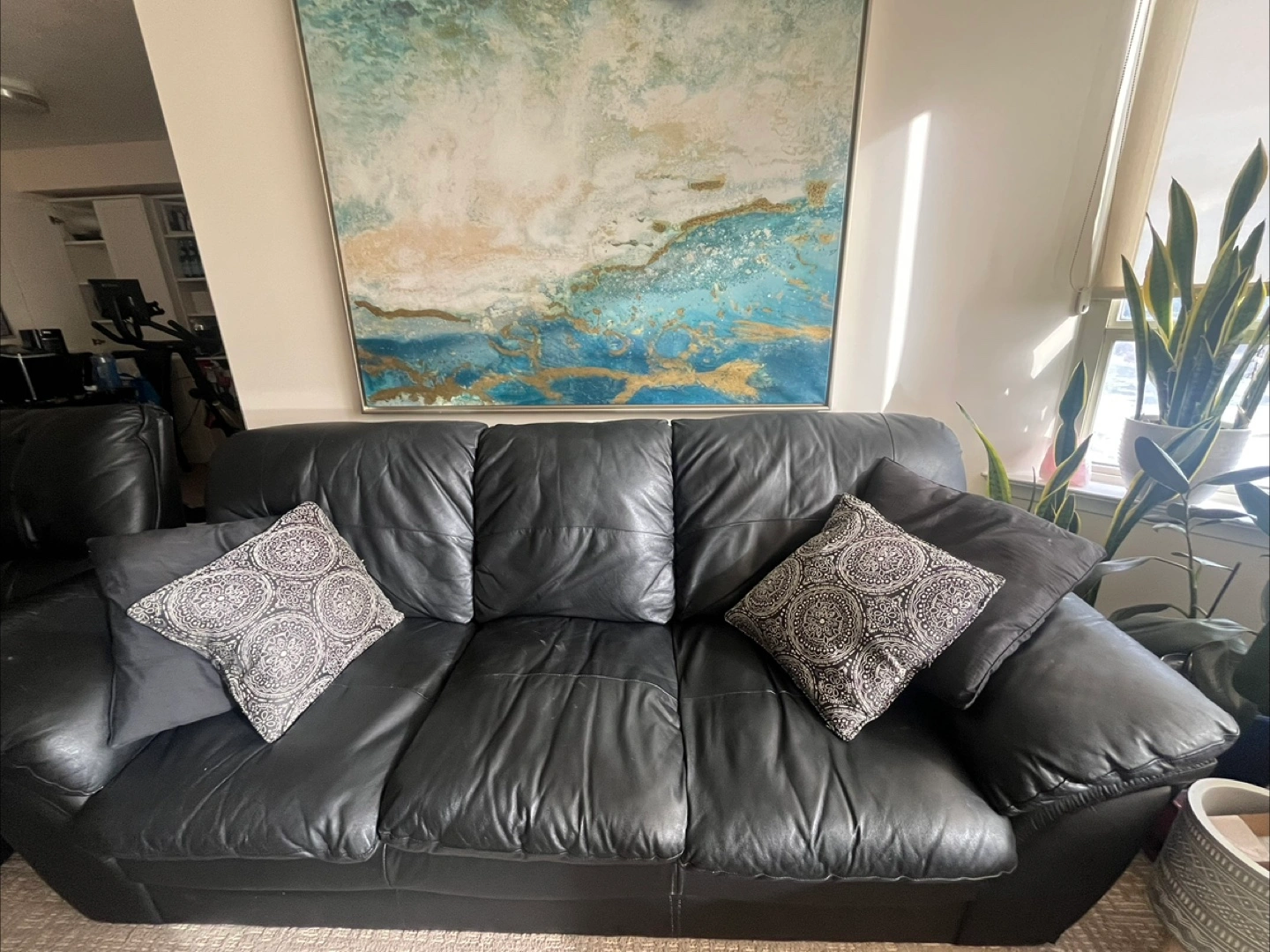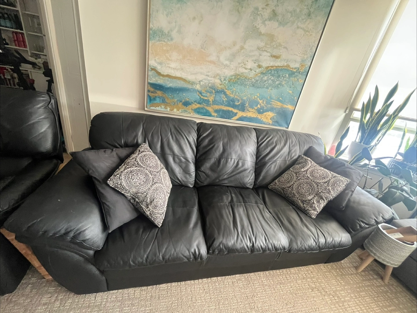 10Three-seater black leather couch. Includes two decorative throw pillows. Good condition. Dimensions: Depth. 36 inches Length. 86 inches height 34 inches Seat depth 23 inches