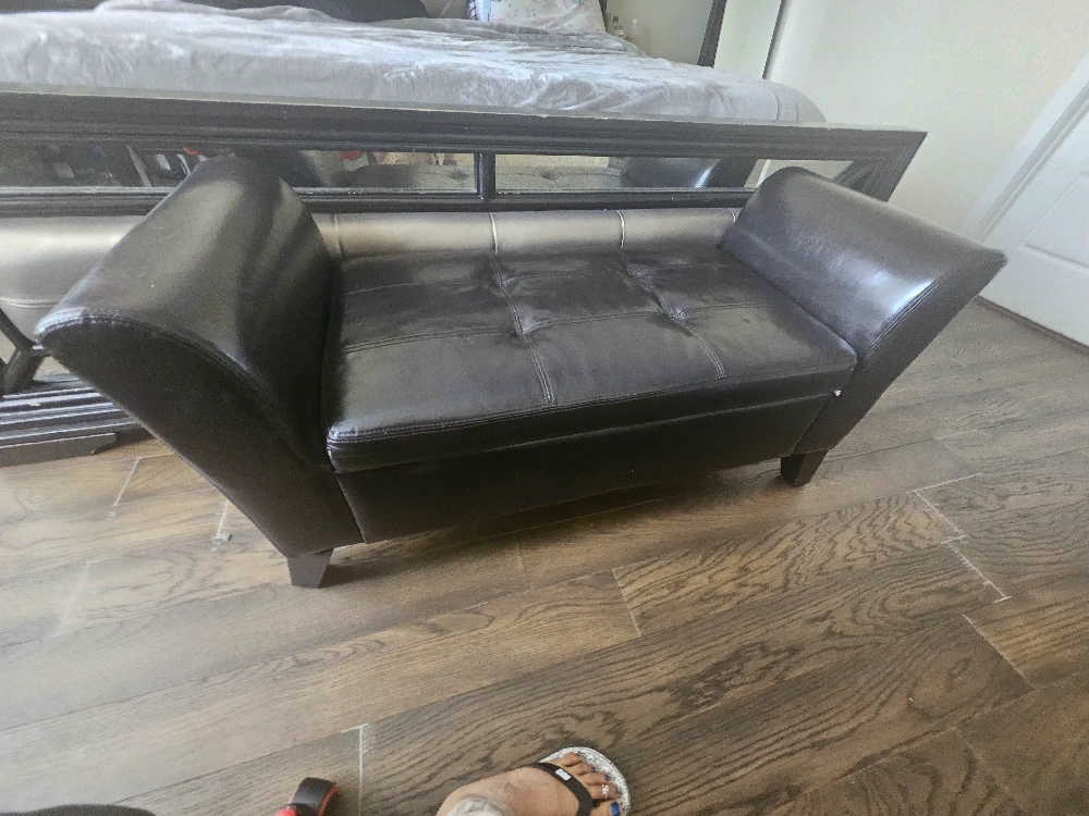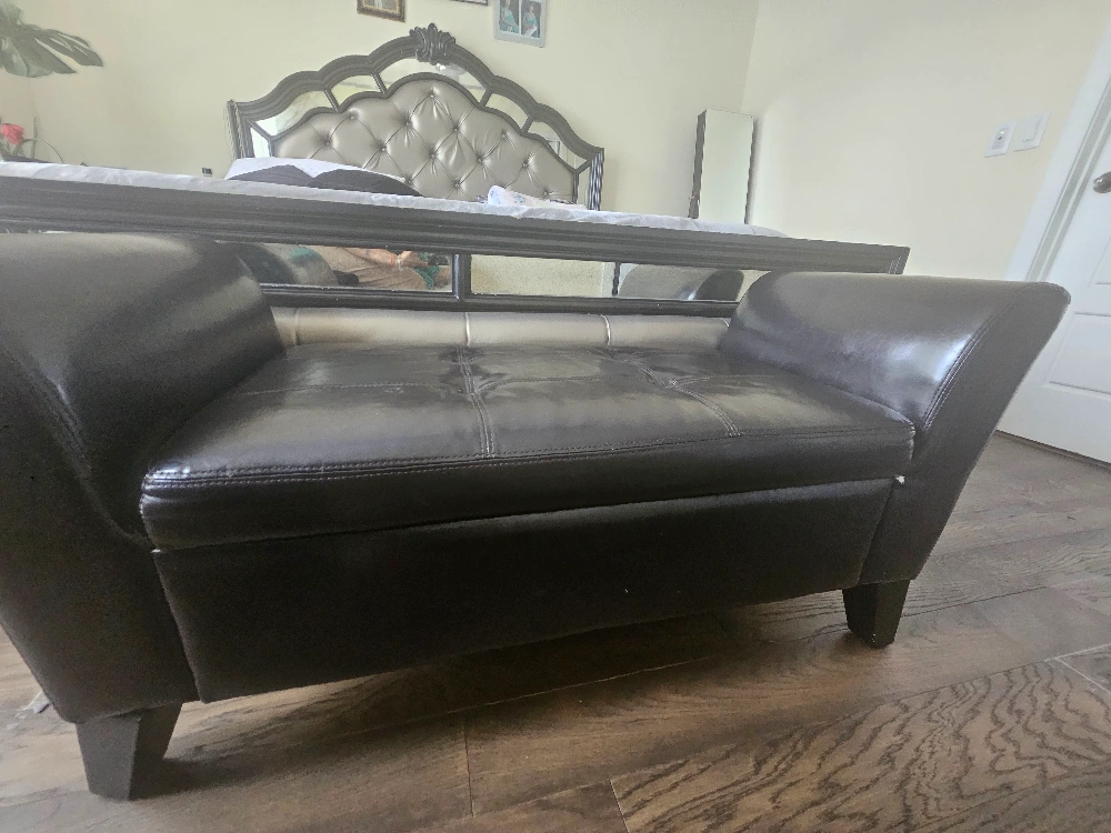 15Selling a black leather storage bench. It's in great condition and perfect for adding extra seating and storage to any room! The bench features a lift-up seat revealing a spacious storage compartment. A stylish and functional addition to your home!