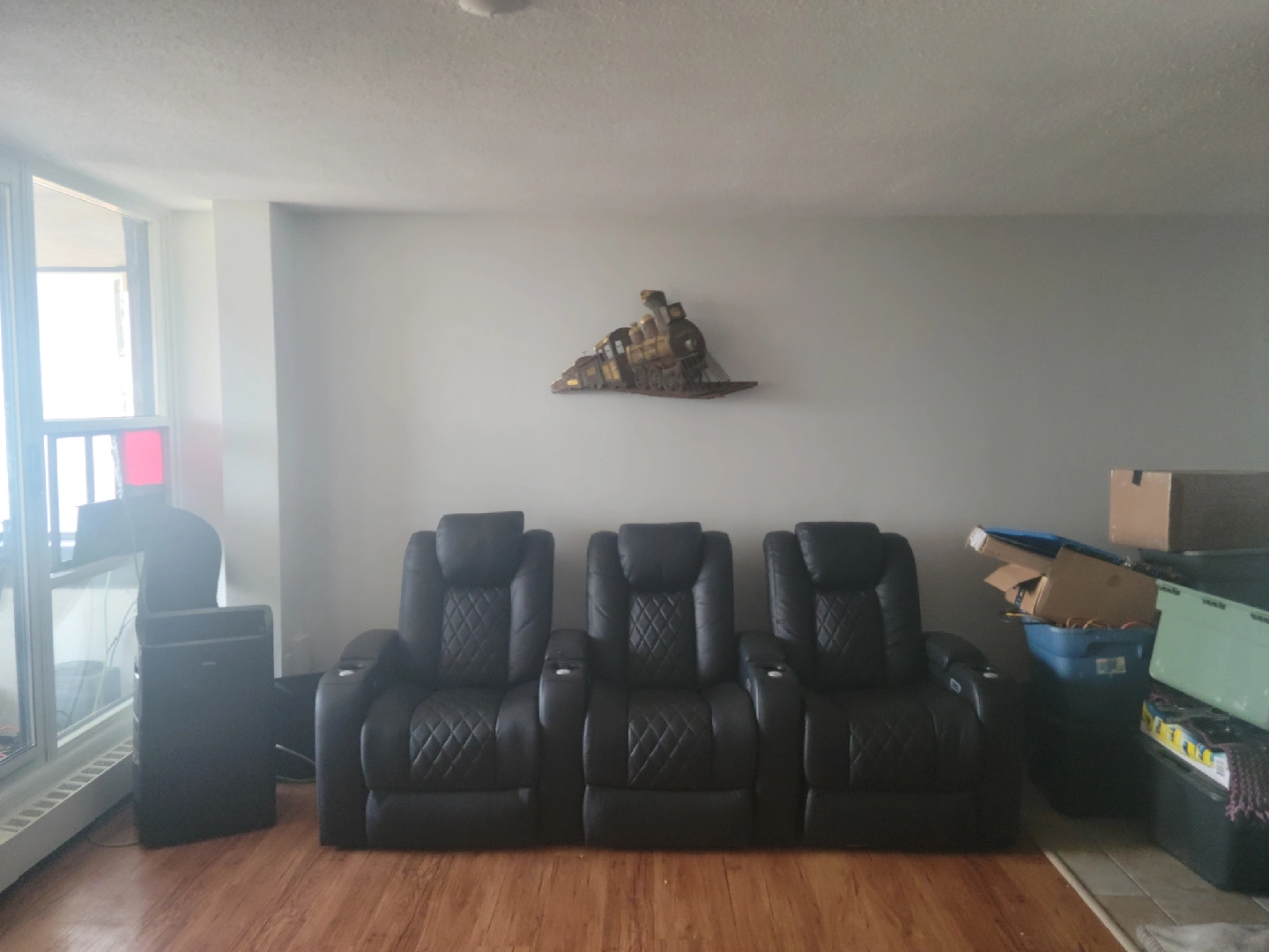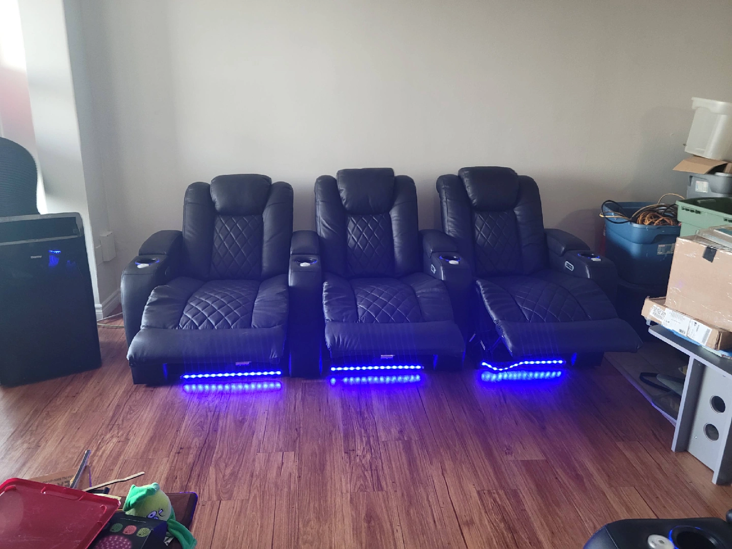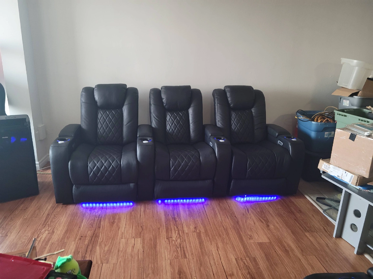 60Selling a set of three black leather reclining theatre seats! They feature a quilted design and cool blue LED lighting underneath. Perfect for creating a home theatre experience right in your living room or basement. These seats are super comfy and in good shape!