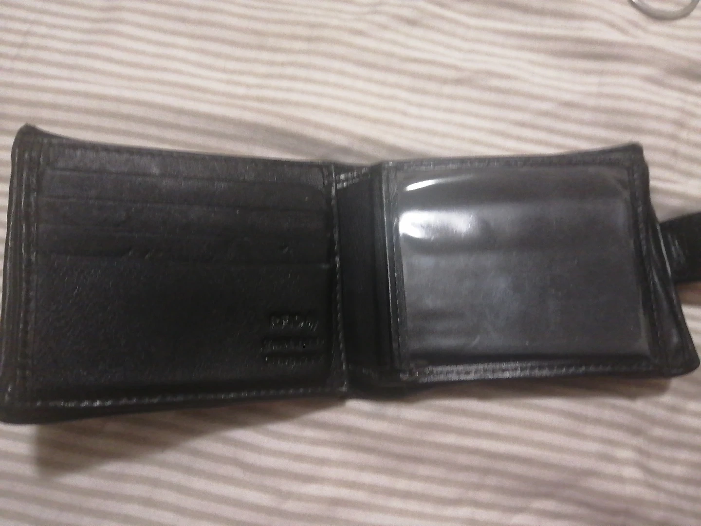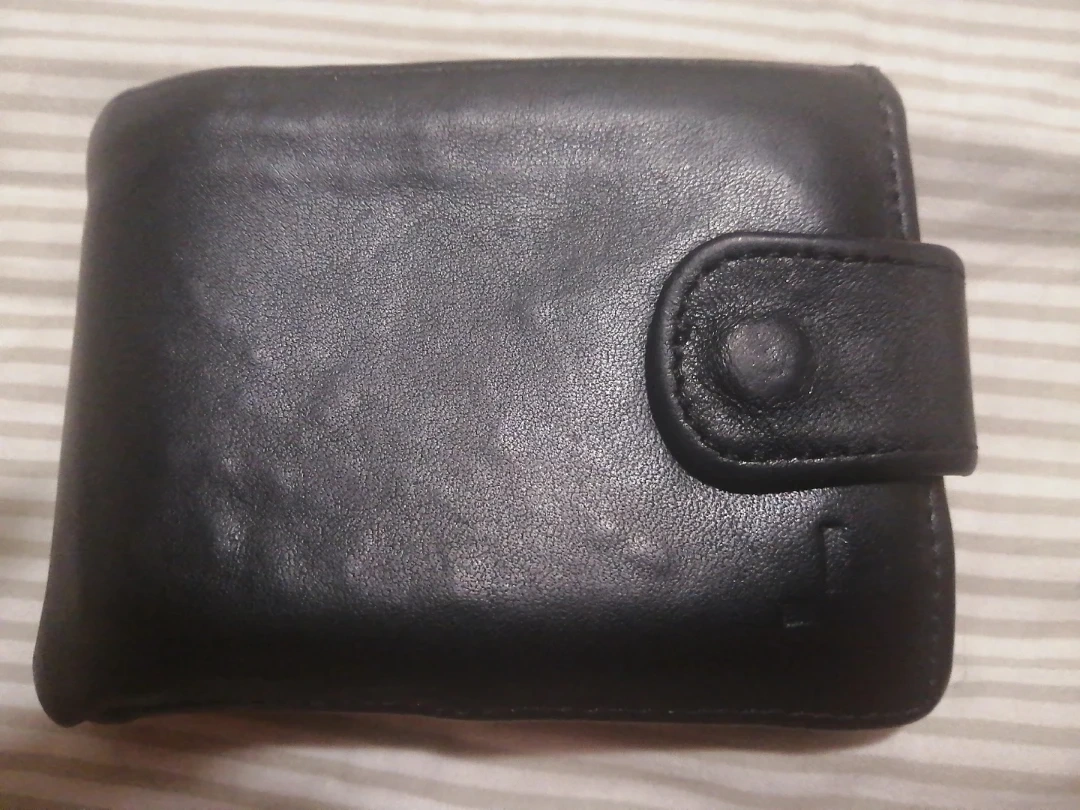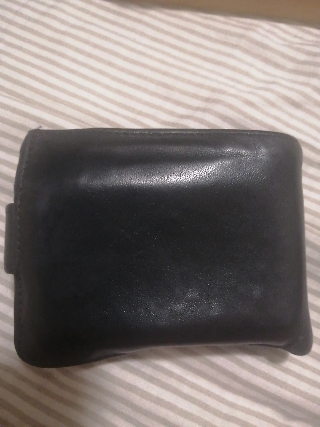 Selling a black leather wallet! It's in good used condition, with lots of space for cards and cash. Perfect for everyday use!