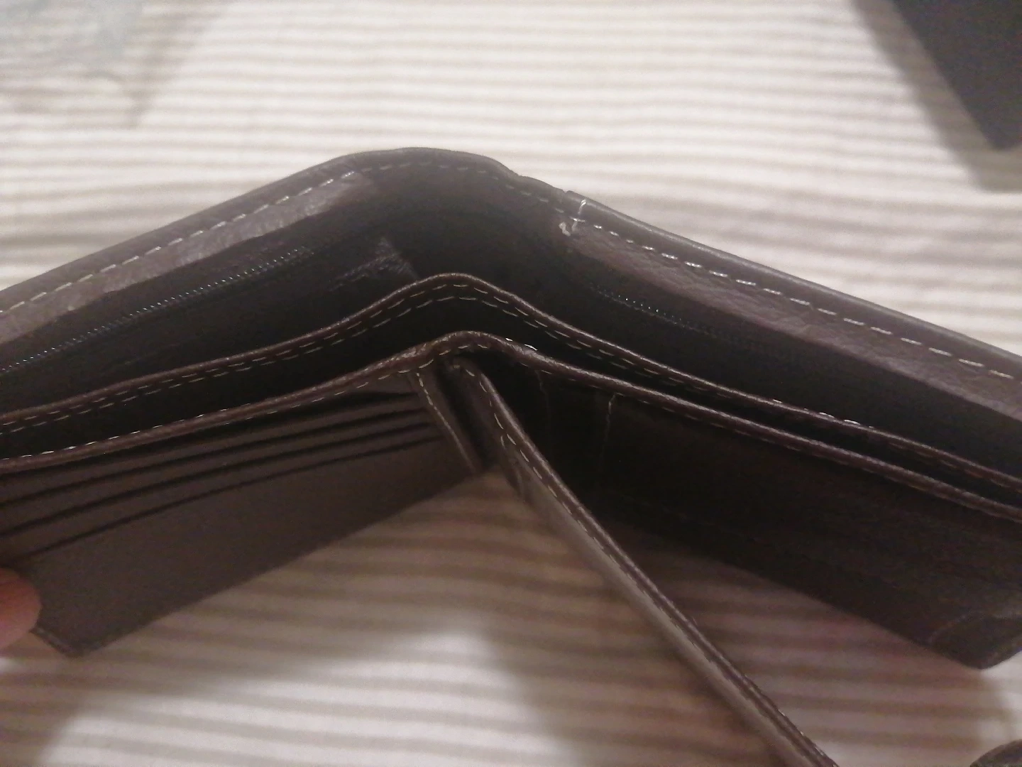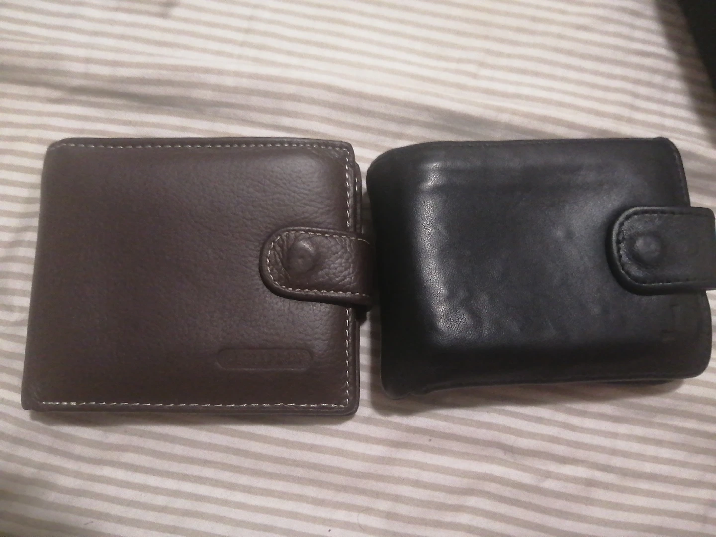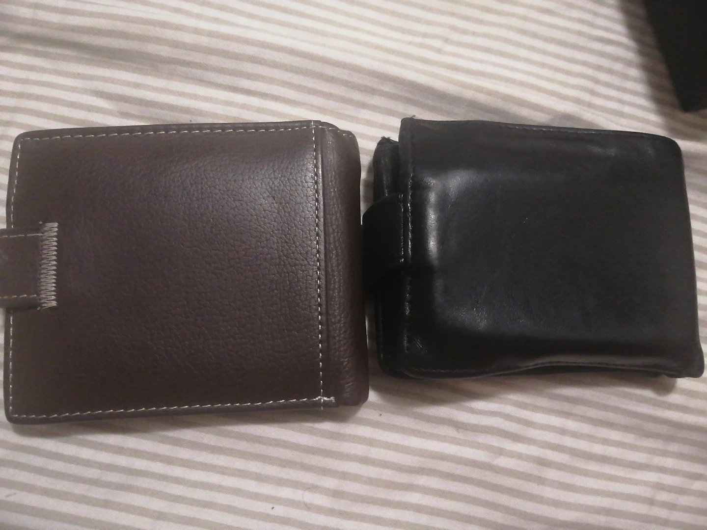 Selling a black leather wallet! It's in good used condition, with lots of space for cards and cash. Perfect for everyday use!