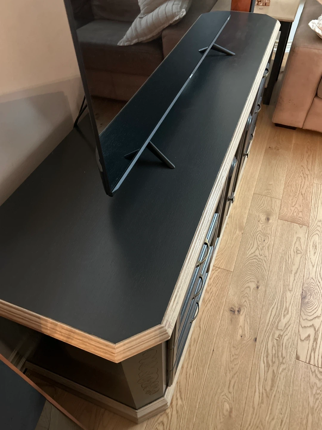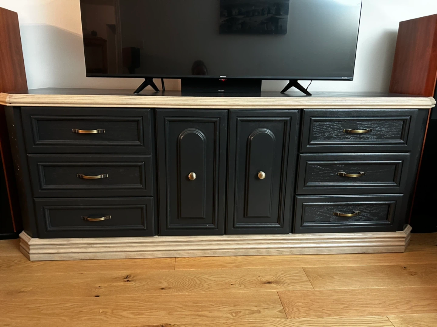 10Selling a stylish TV stand or console table. It's a great piece for your living room or entertainment area. The unit features a combination of black and light wood, offering a modern and sophisticated look. It has drawers and doors for ample storage space for your media devices and accessories