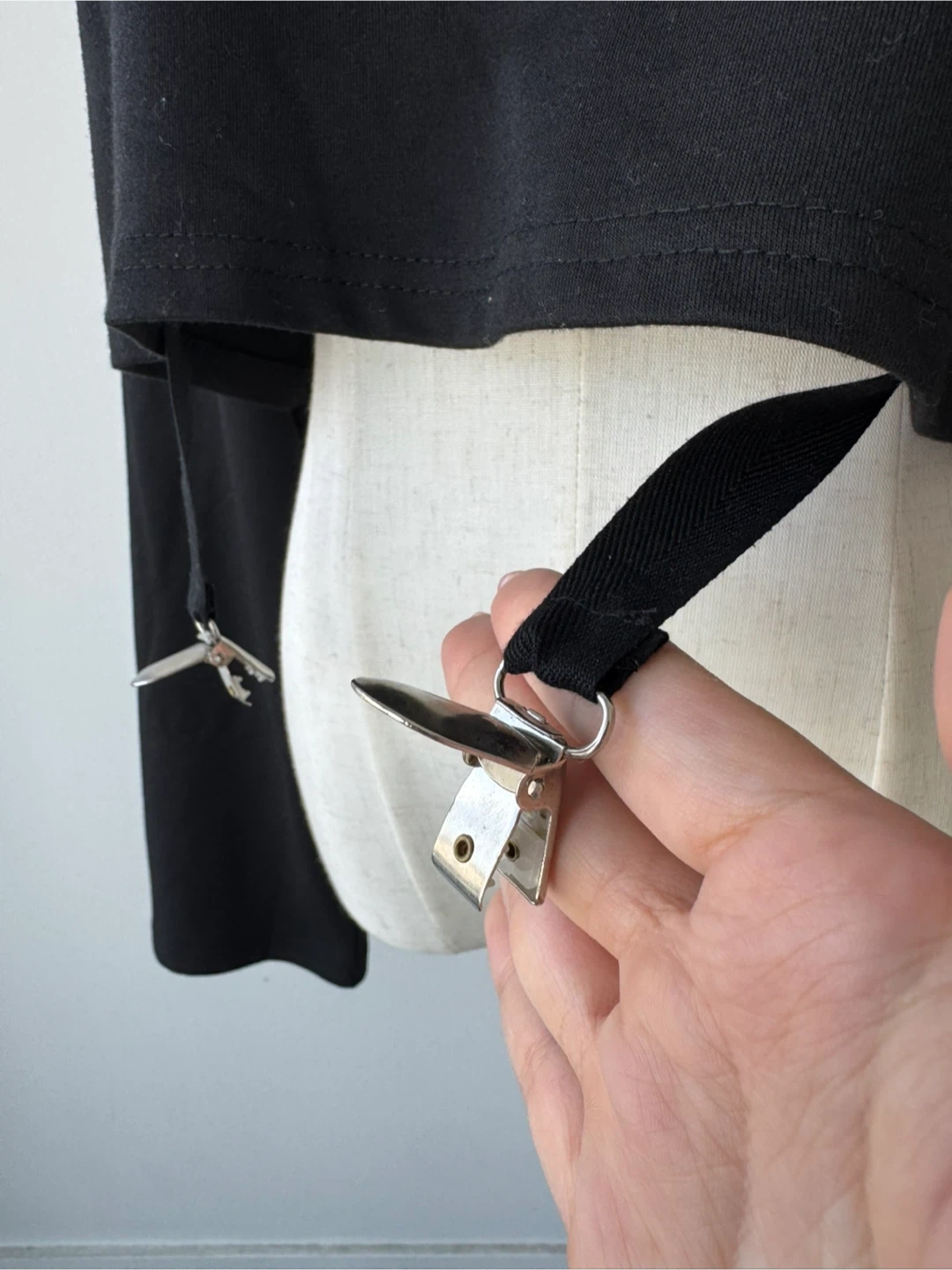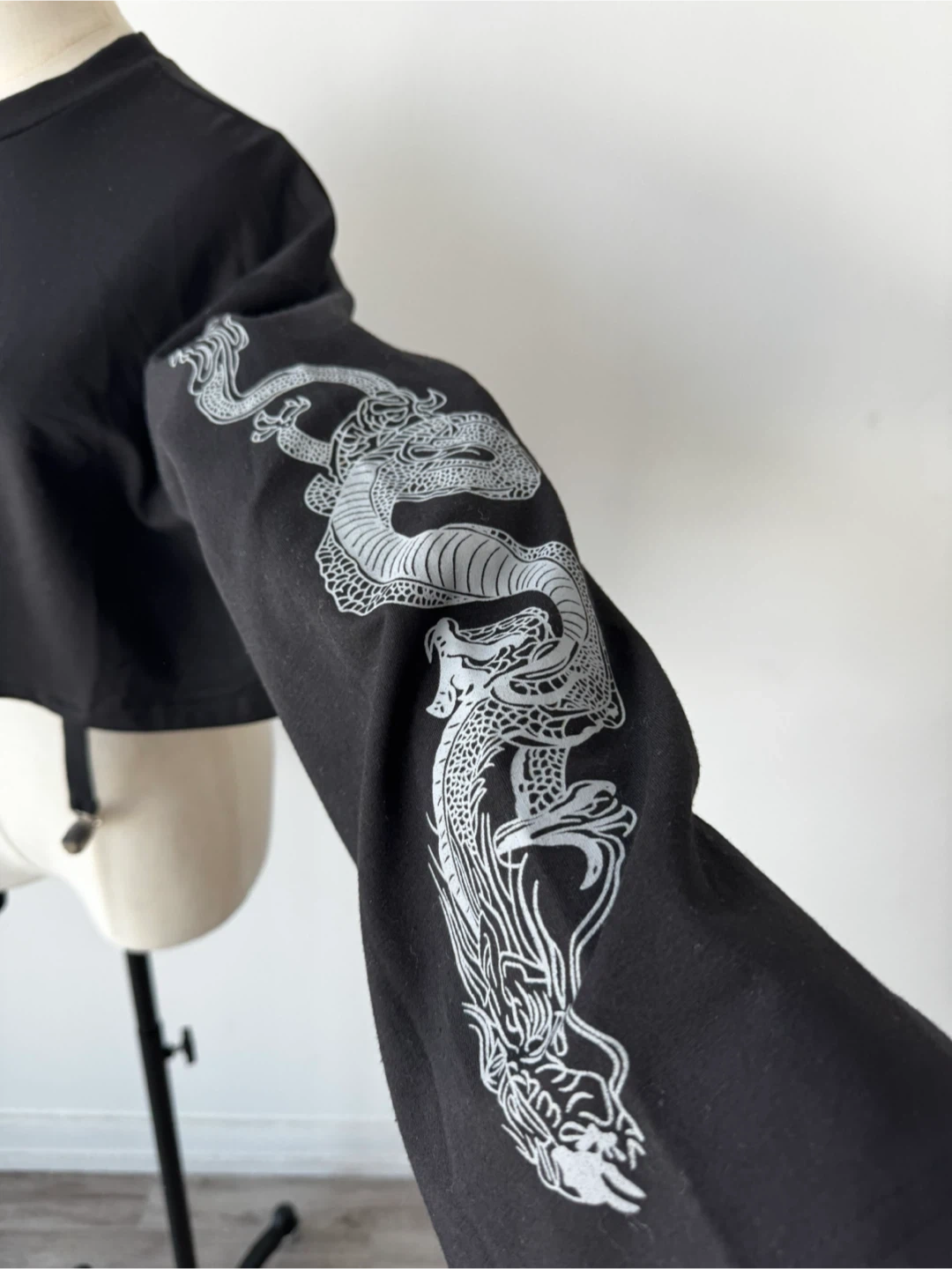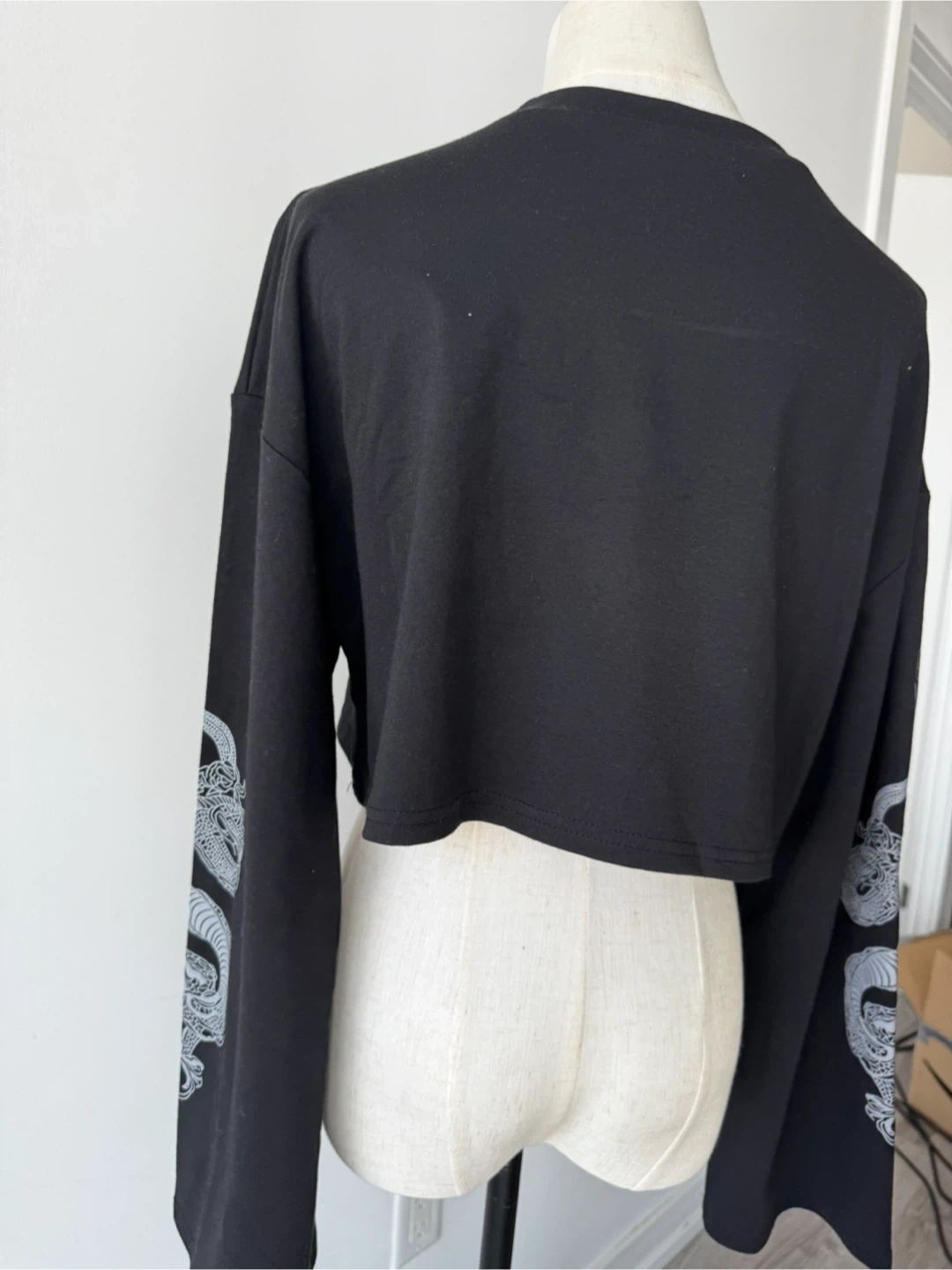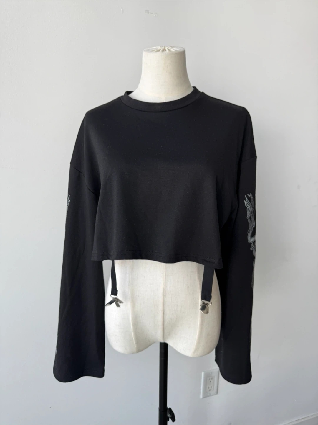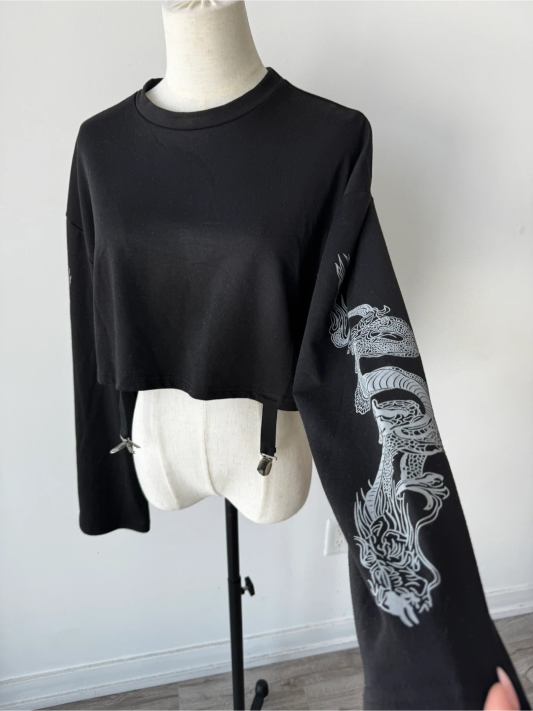 Selling a black long sleeve crop top with a cool dragon design on the sleeves! It also has unique straps with clips at the bottom. It's in great condition and ready for a new home!