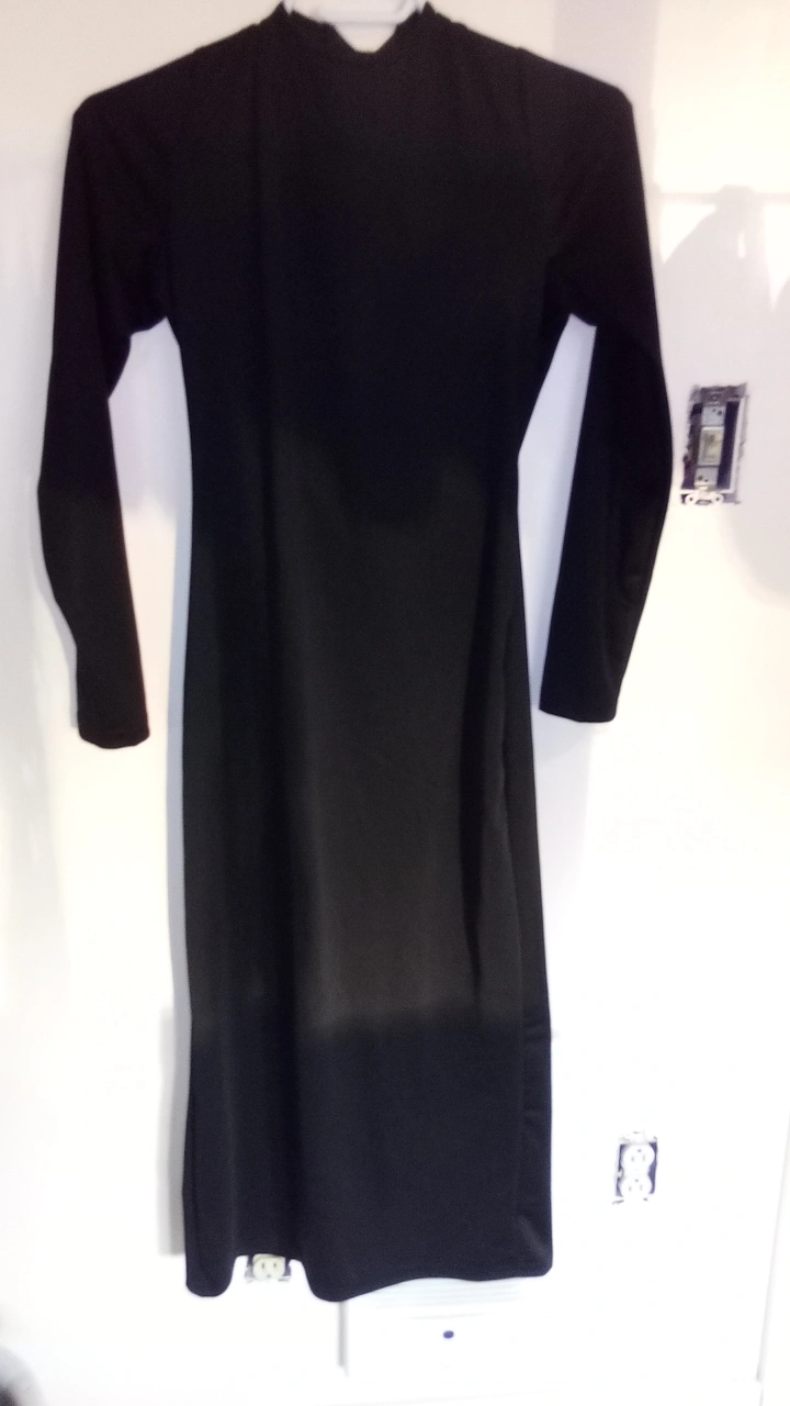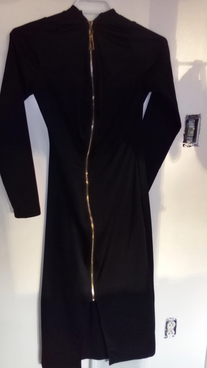 10Selling a black long sleeve dress. It features a gold zipper down the back. It's in good condition and ready for a new home!