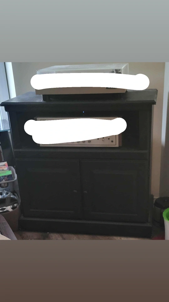 10Selling a black media console cabinet. It has a spot for a record player on top and a shelf for other electronics. There's also a cabinet with doors for storage. Pick-up only